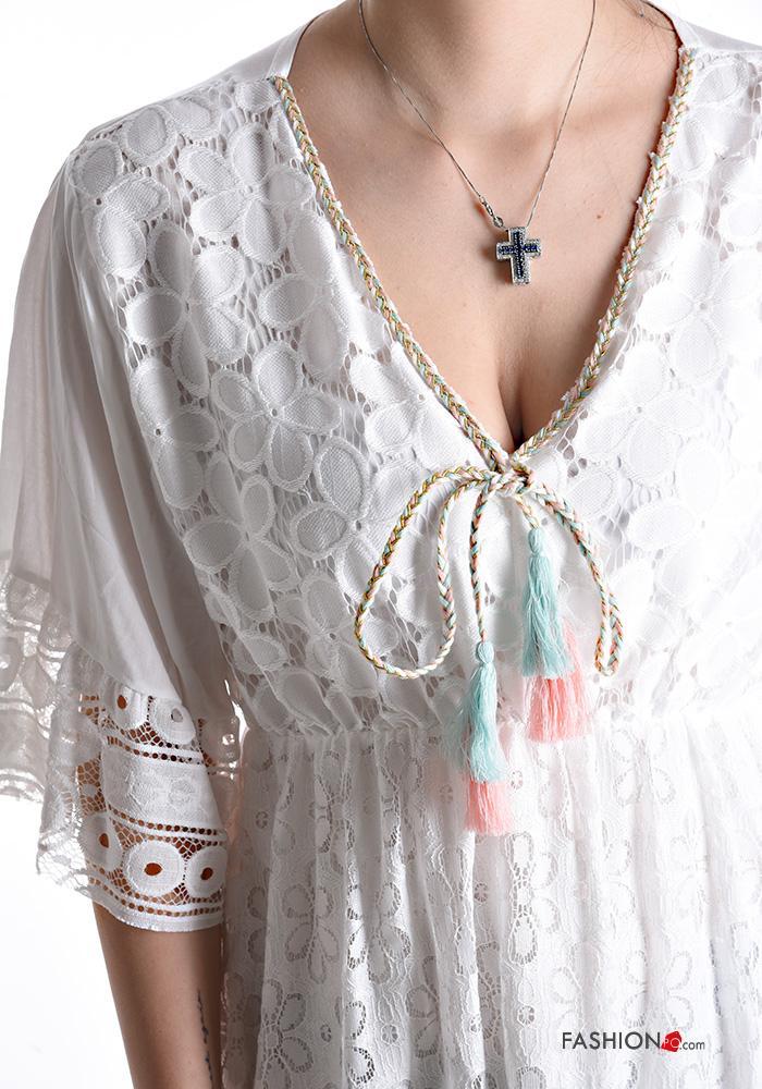 ruffle sleeve knee-length lace trim Cotton Dress 3/4 sleeve plunging neckline with v-neck