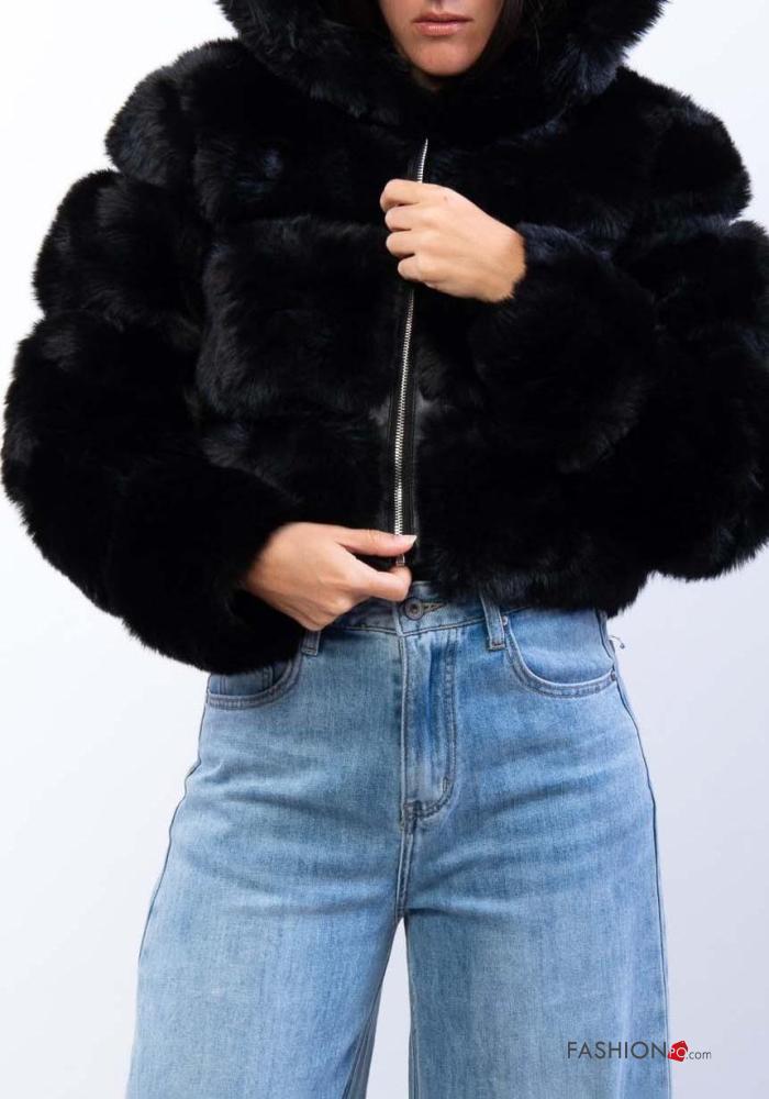 Cappotto corto pelliccia sintetica maniche lunghe con zip con cappuccio