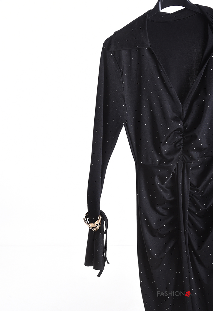 Home > Roupa > Vestidos > Vestido brilhante manga com folhos com gola gola V com nó com fenda