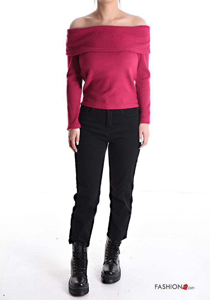 Gerippte lange ärmel Langarmshirt bardot-ausschnitt