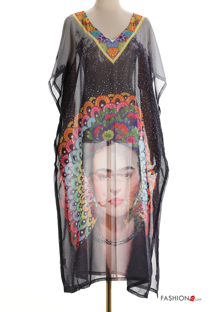 Home > Kleidung > Bademode > Kunstmuster kurze ärmel lange chiffon Strandkleid mit V-Ausschnitt mit schlitz