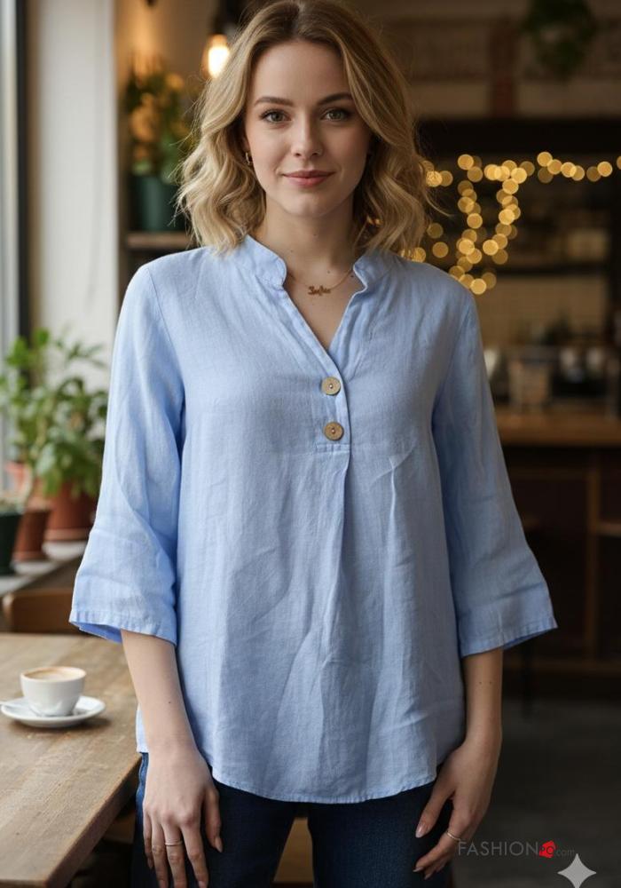 Home > Kleidung > Hemden & Blusen > Bluse aus Leinen mit Knöpfen 3/4 ärmel mit V-Ausschnitt