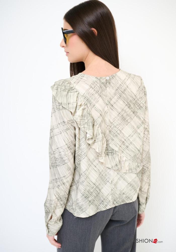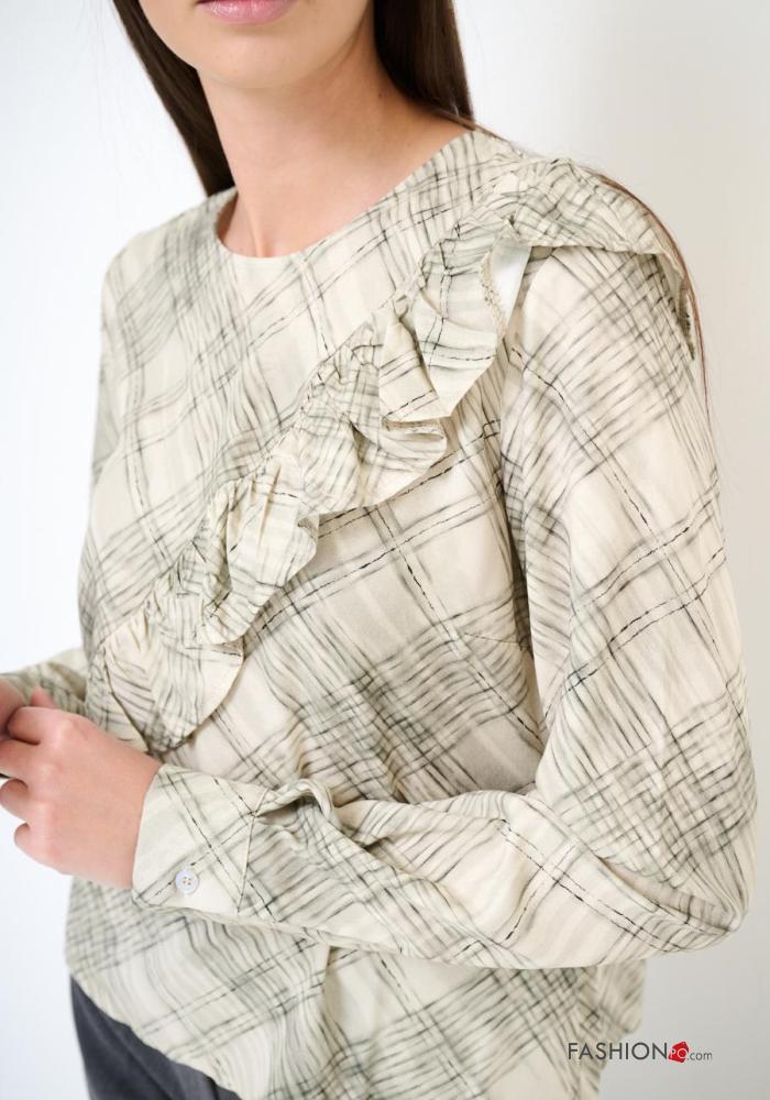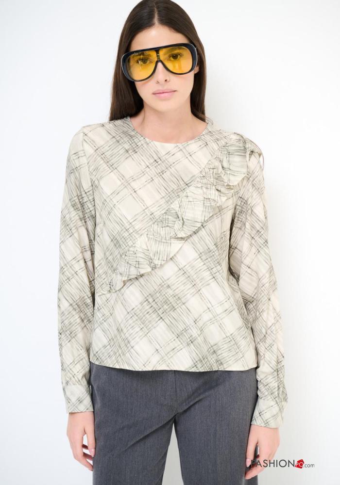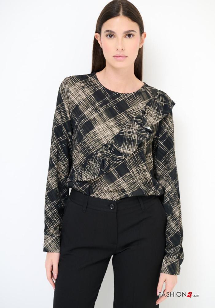 Geometrisches Muster lange ärmel u-boot ausschnitt Bluse mit Volants