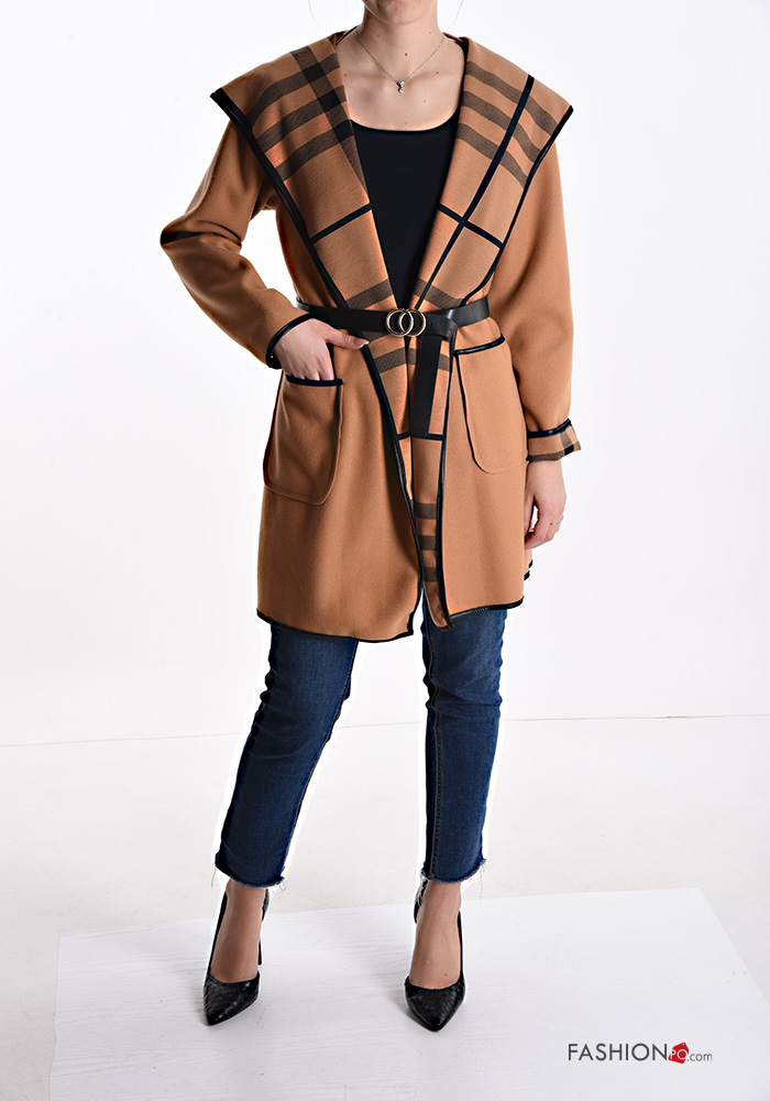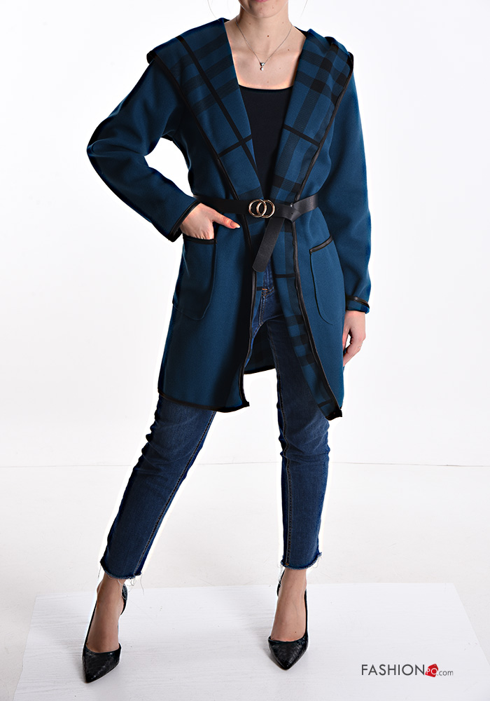 Tartan-Muster Duster-Mantel mit Gürtel mit Kapuze mit Taschen