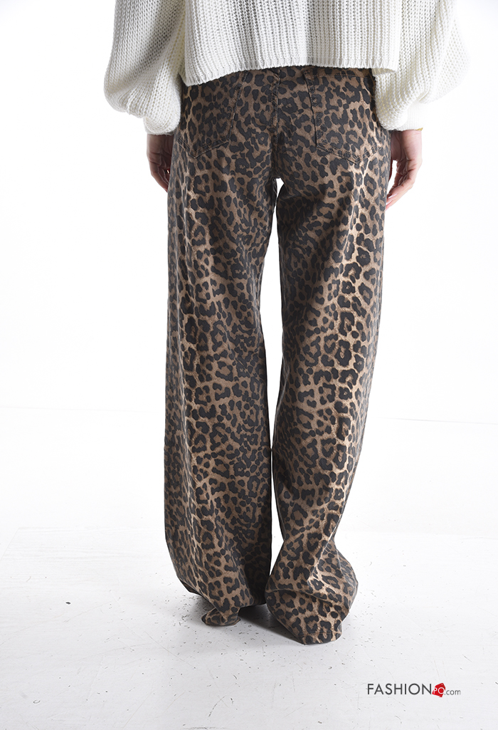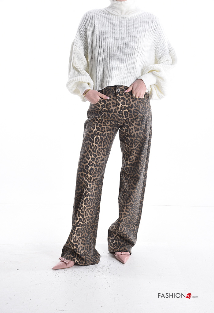 Tiermuster wide leg lange Jeans aus Baumwolle mit Knöpfen mit Reißverschluss mit Taschen