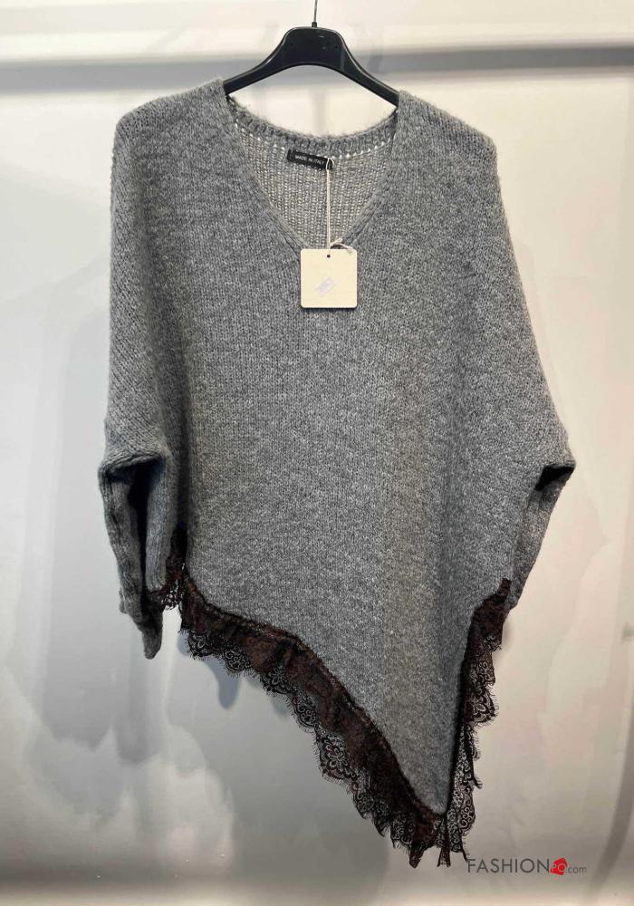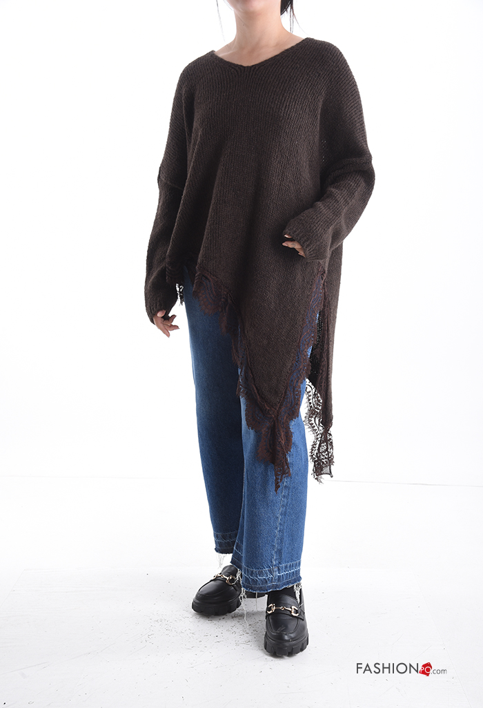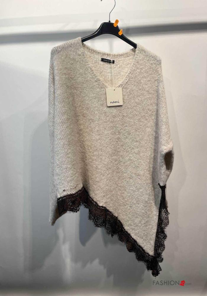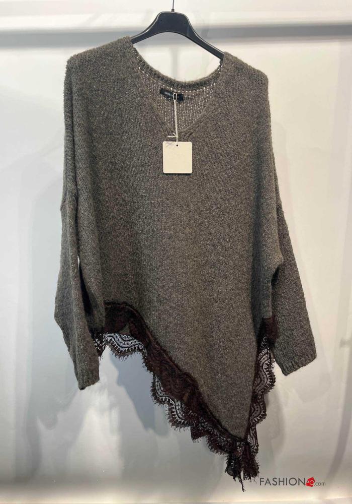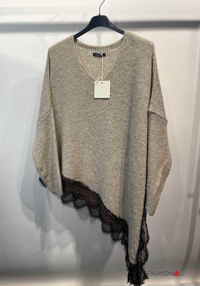Spitze- asymmetrisch lange ärmel Oversize Strickpullover aus Wollmischung mit V-Ausschnitt mit schlitz