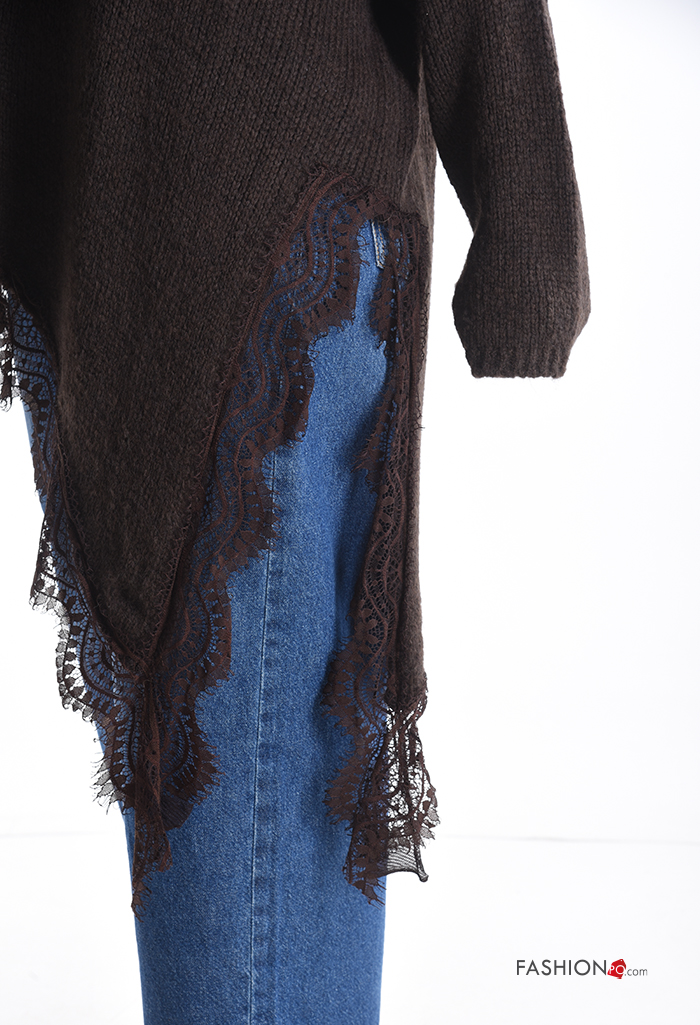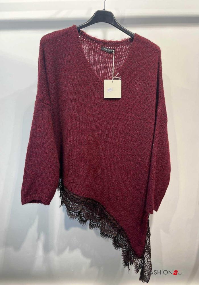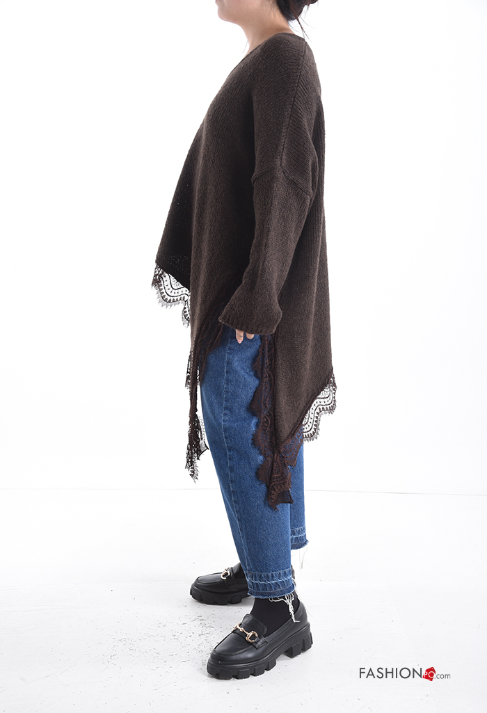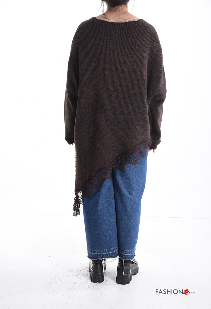 Spitze- asymmetrisch lange ärmel Oversize Strickpullover aus Wollmischung mit V-Ausschnitt mit schlitz