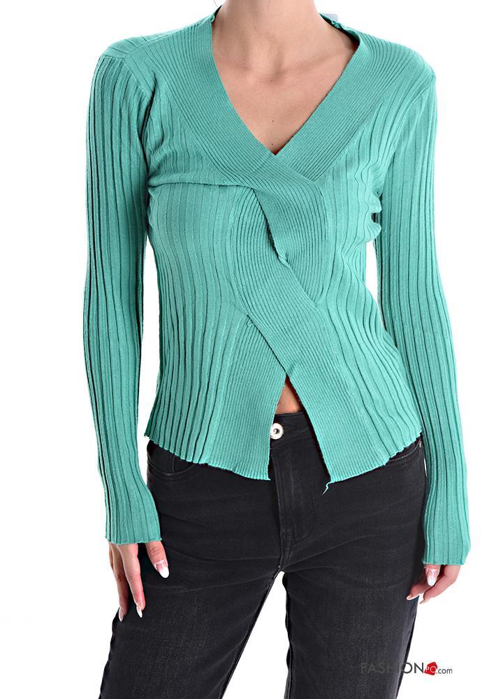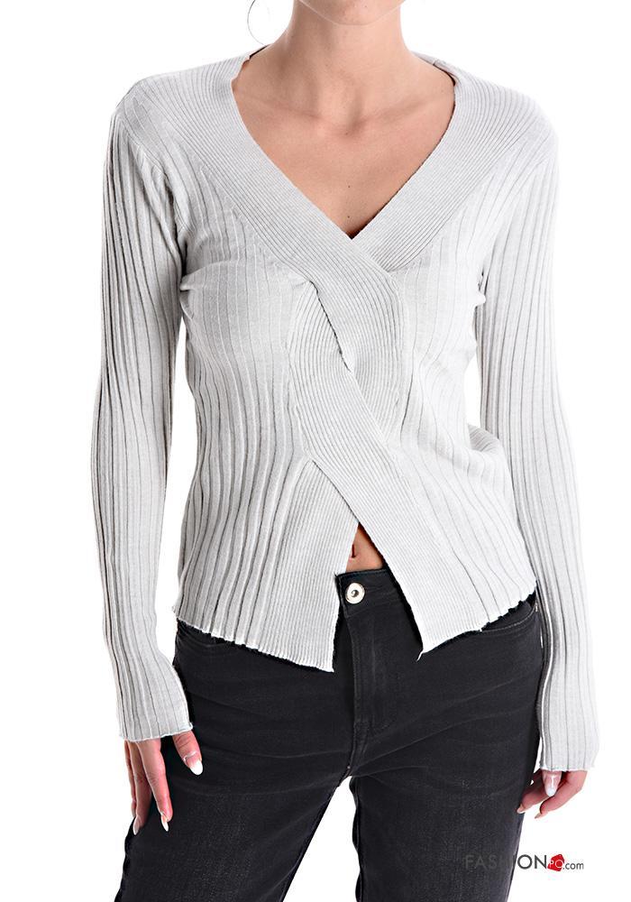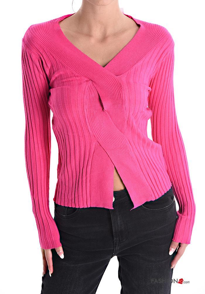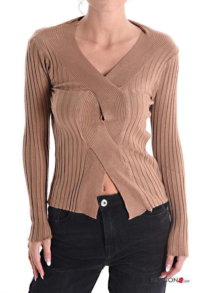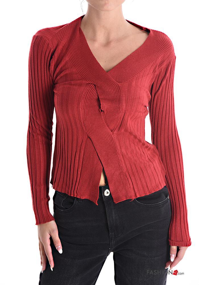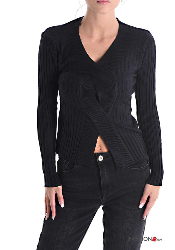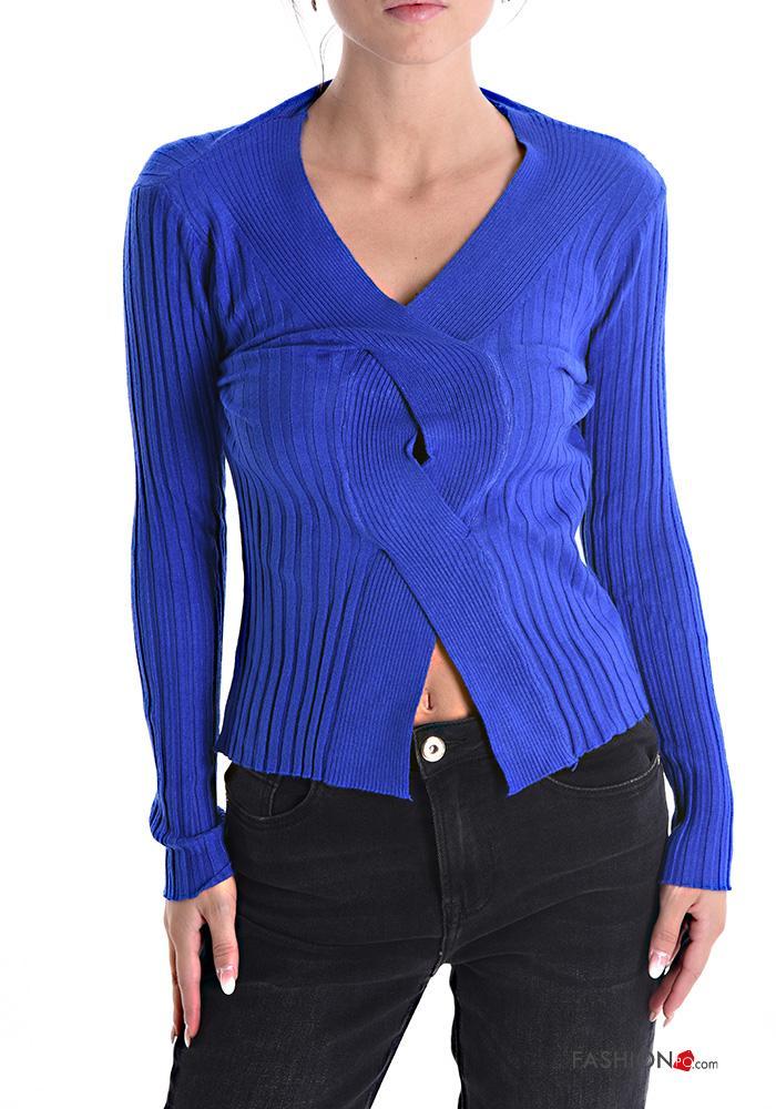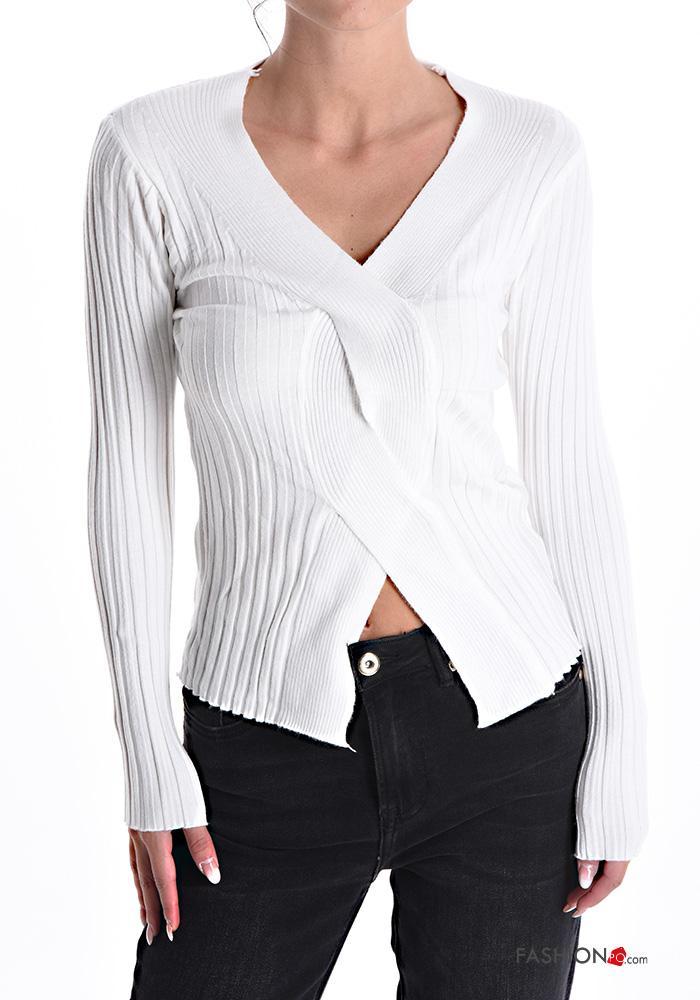 Gerippte lange ärmel Strickpullover mit V-Ausschnitt mit knoten