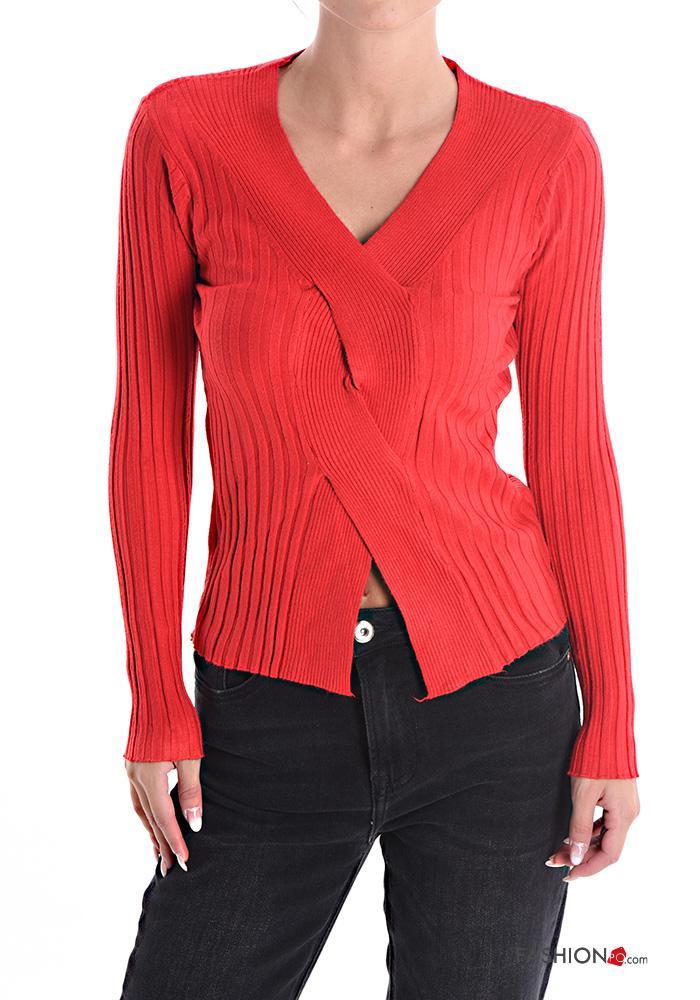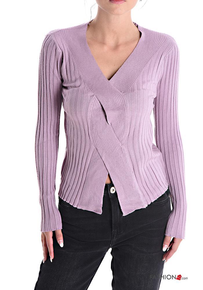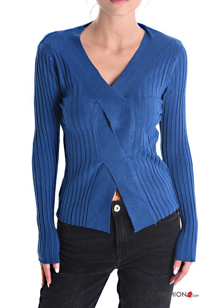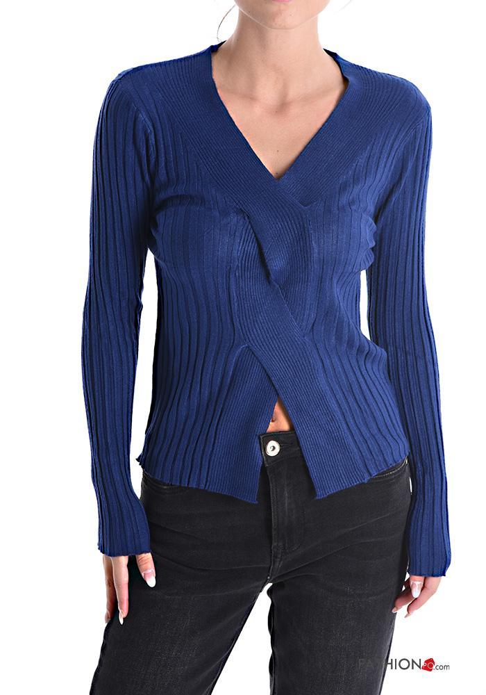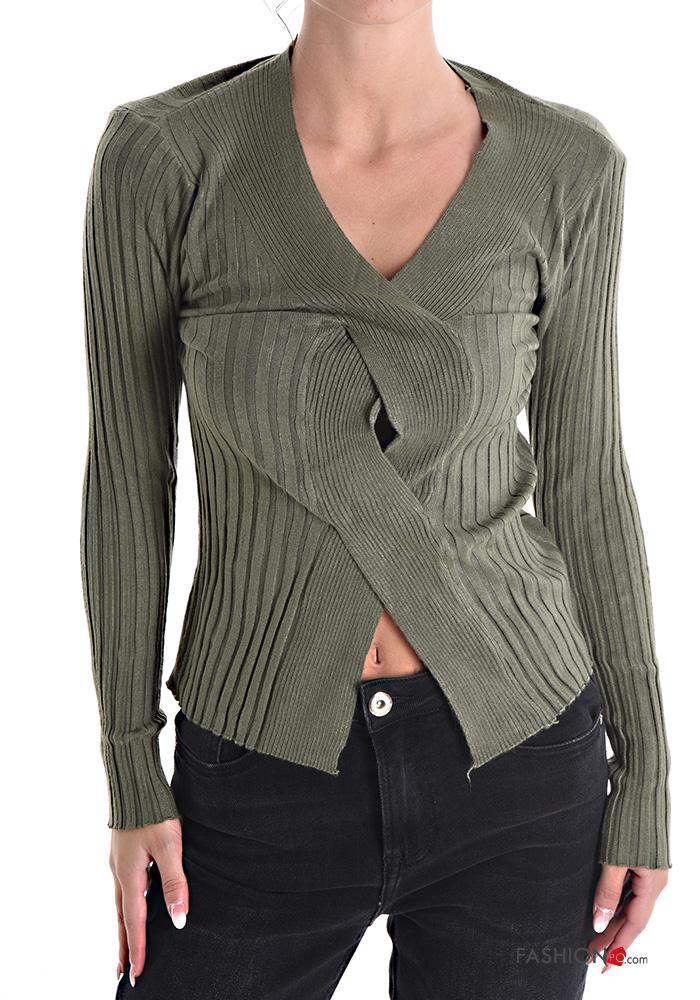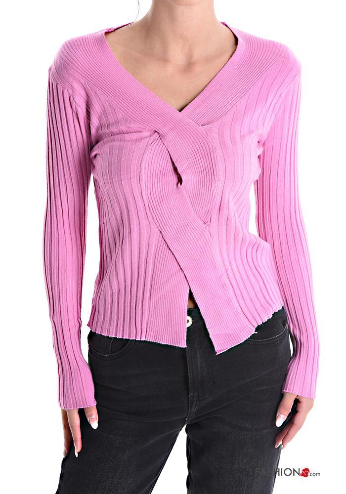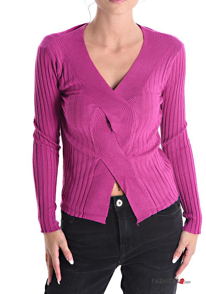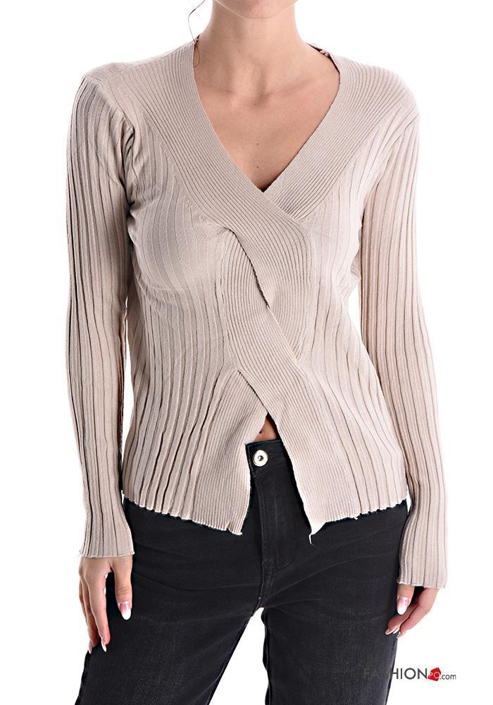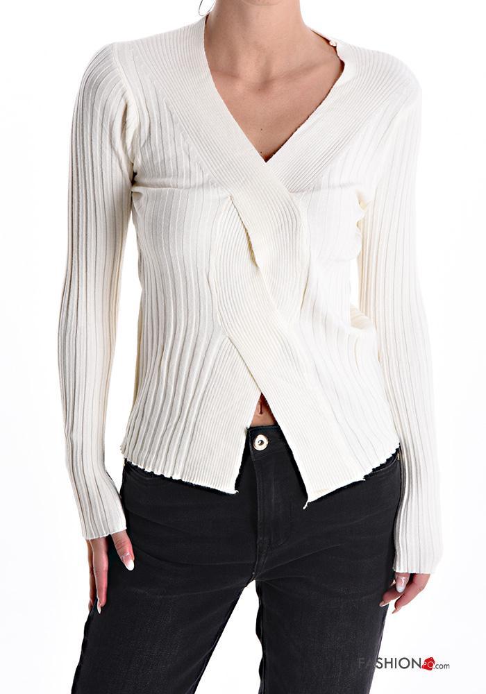 Gerippte lange ärmel Strickpullover mit V-Ausschnitt mit knoten