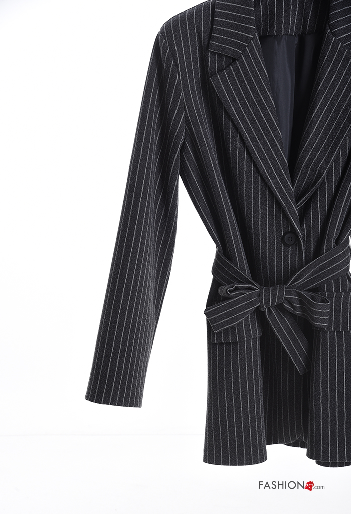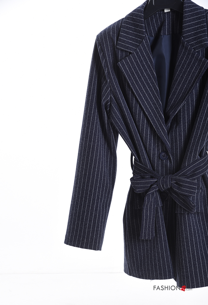 Striped long sleeve Coat with buttons with fabric belt