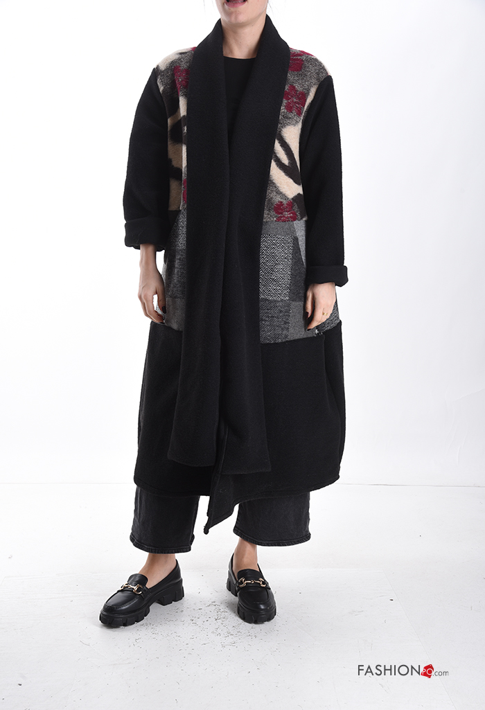 Abstract print oversized long sleeve Wool Mix Duster Coat with pockets