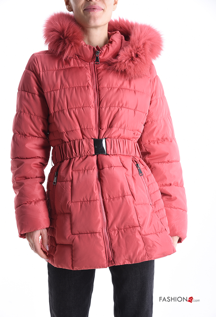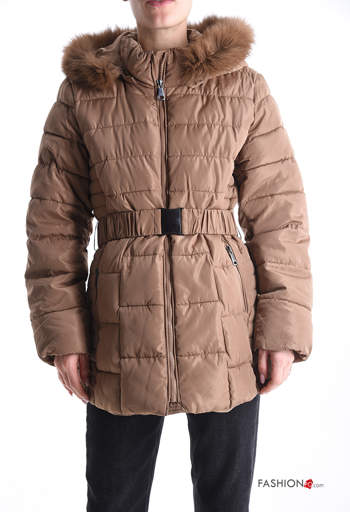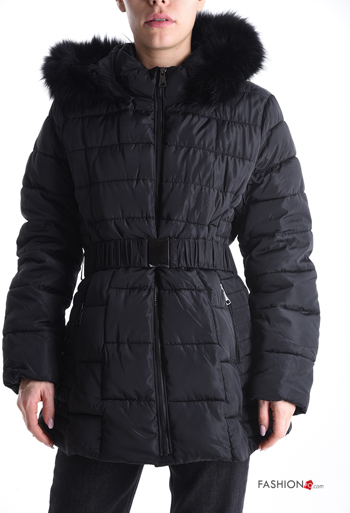faux fur Puffer Jacket with belt with pockets with hood with zip