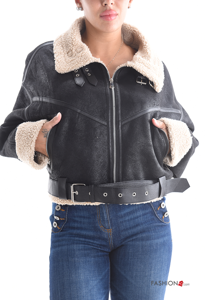 with buckle long sleeve faux leather Biker Jacket with pockets with zip