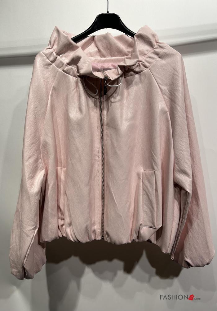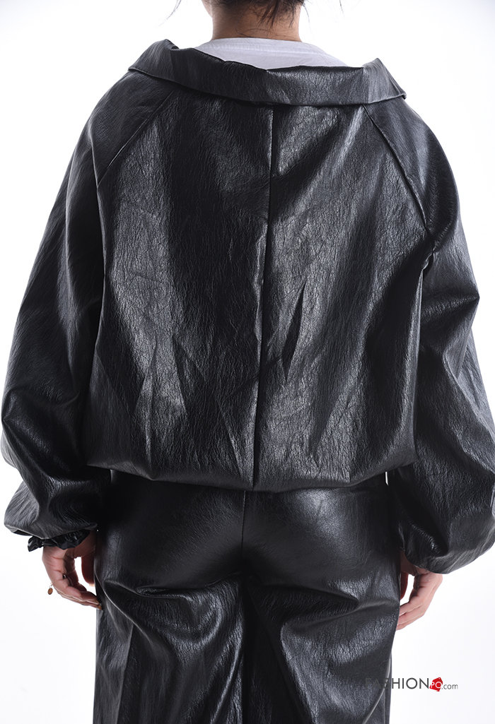 long sleeve with collar faux leather Jacket with zip with elastic