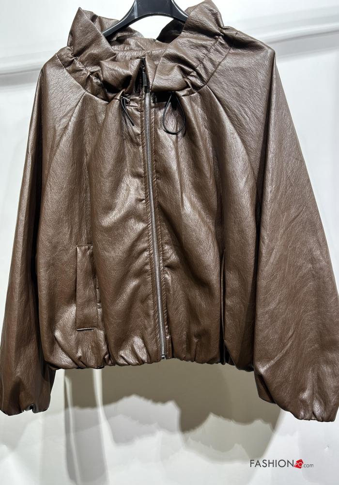 Home > Clothing > Coats & Jackets > long sleeve with collar faux leather Jacket with zip with elastic