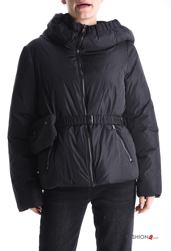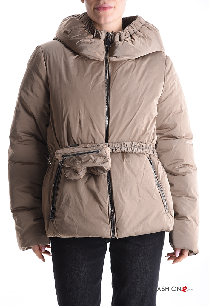 Puffer Jacket with belt with hood with lining with pockets with zip with Pouch bag