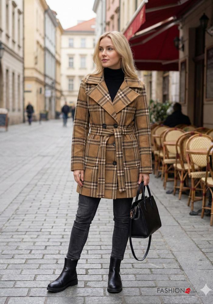 Tartan double-breasted Coat with belt without lining with pockets
