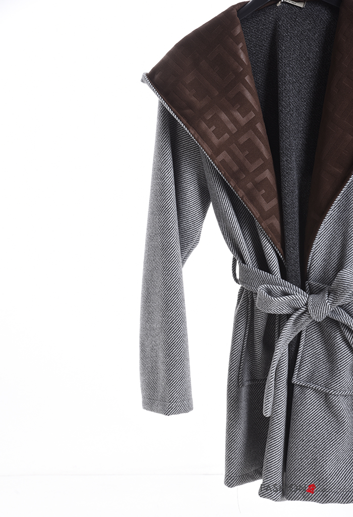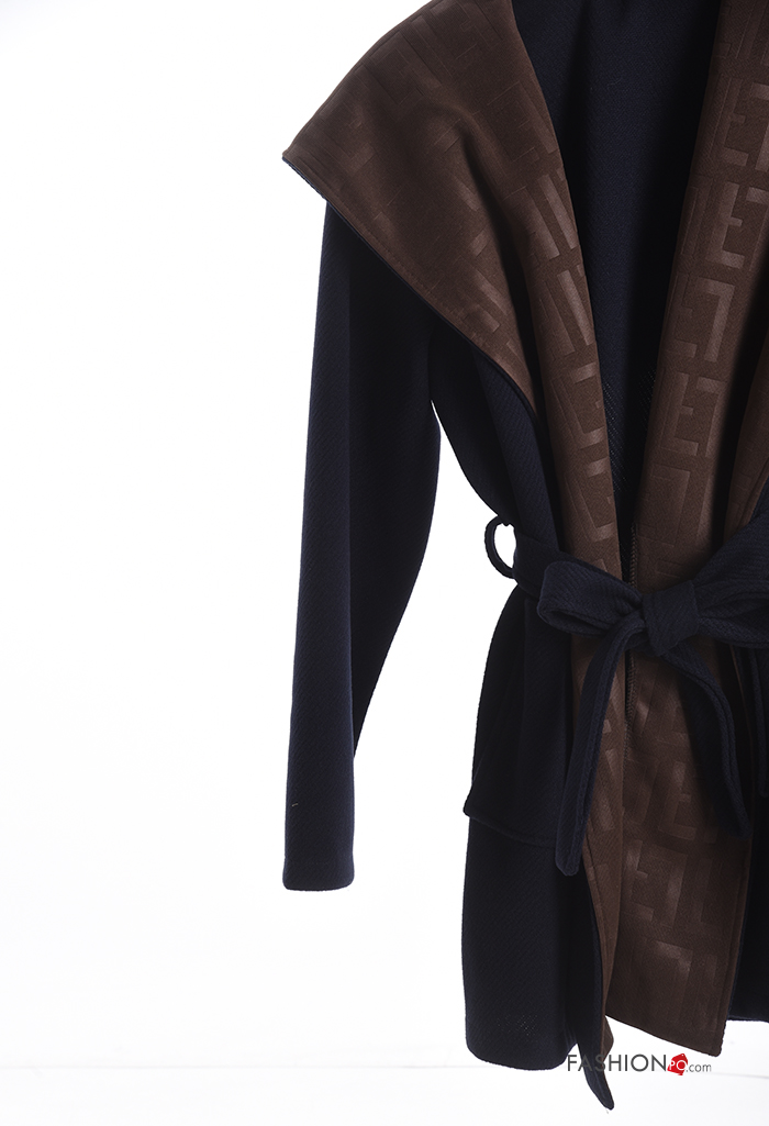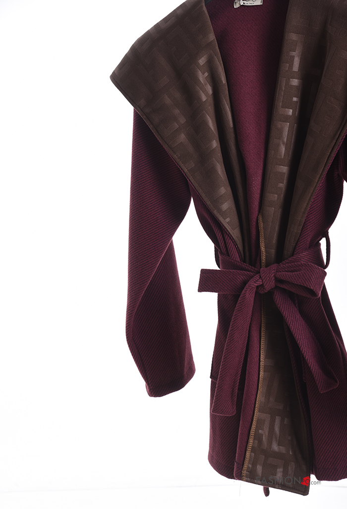 long sleeve Wool Mix Coat with hood with fabric belt without lining with pockets