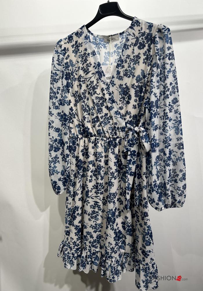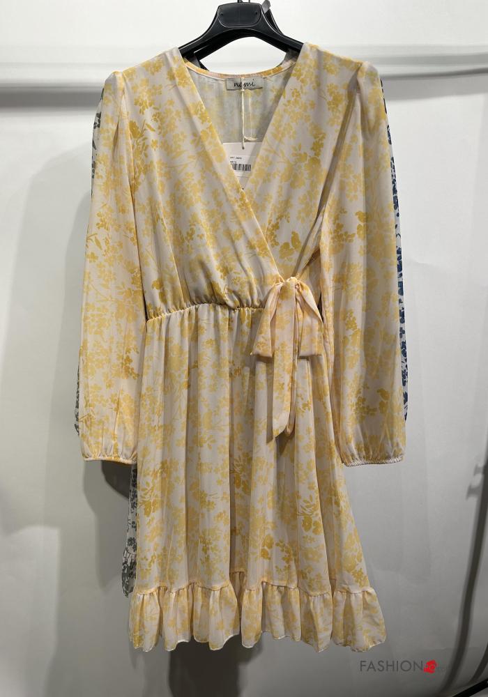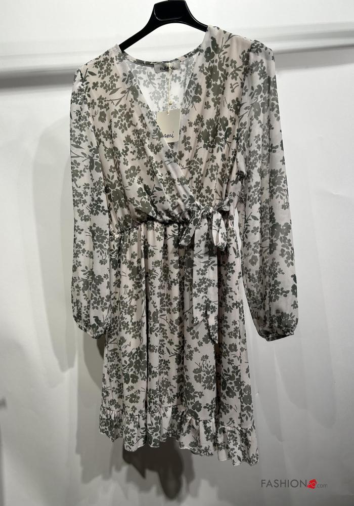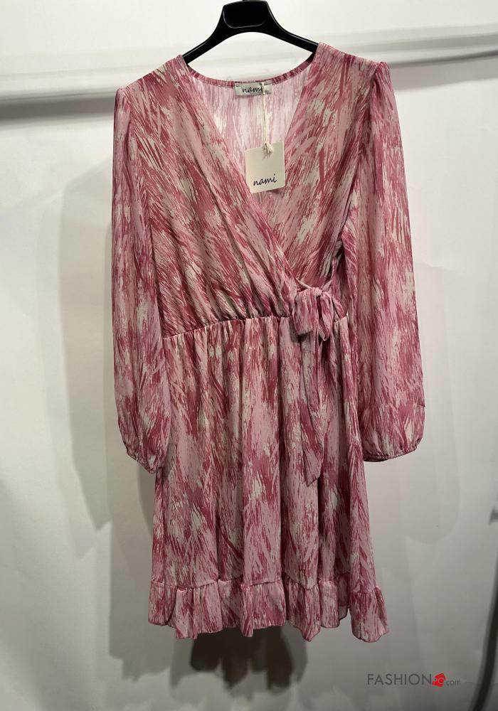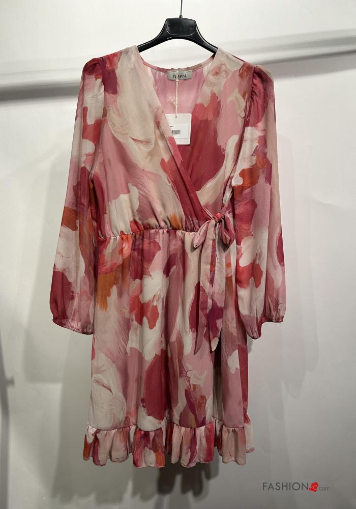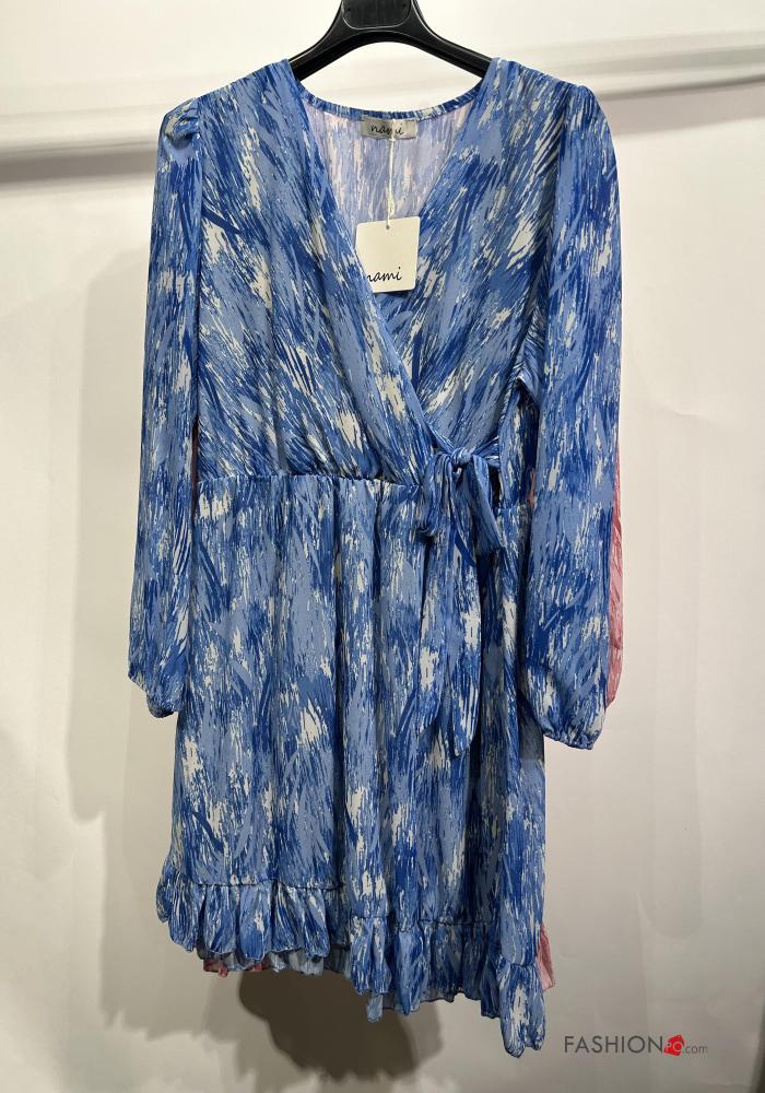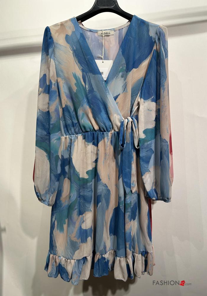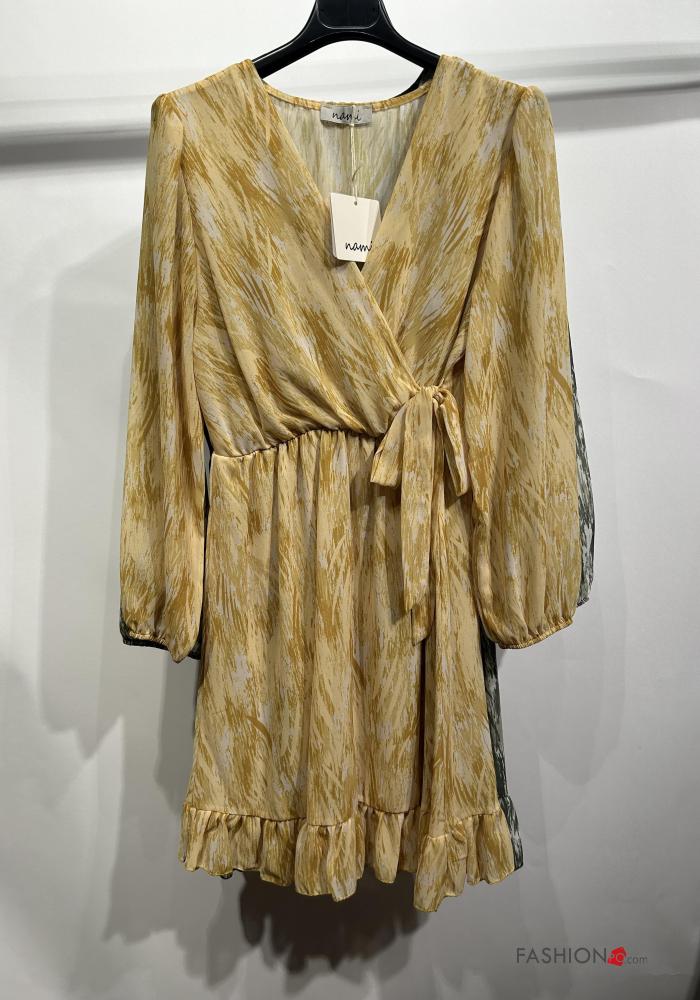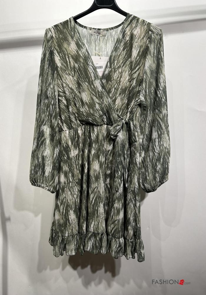 Abstract print long sleeve Dress with flounces with v-neck with bow