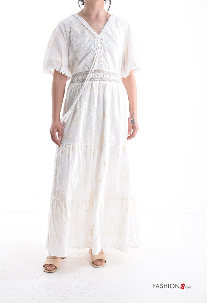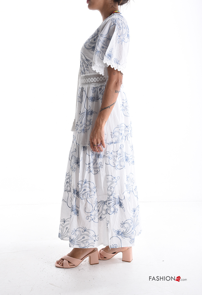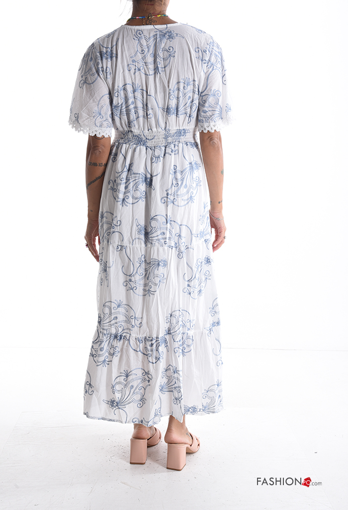 Abstract print short sleeve long Cotton Dress with v-neck