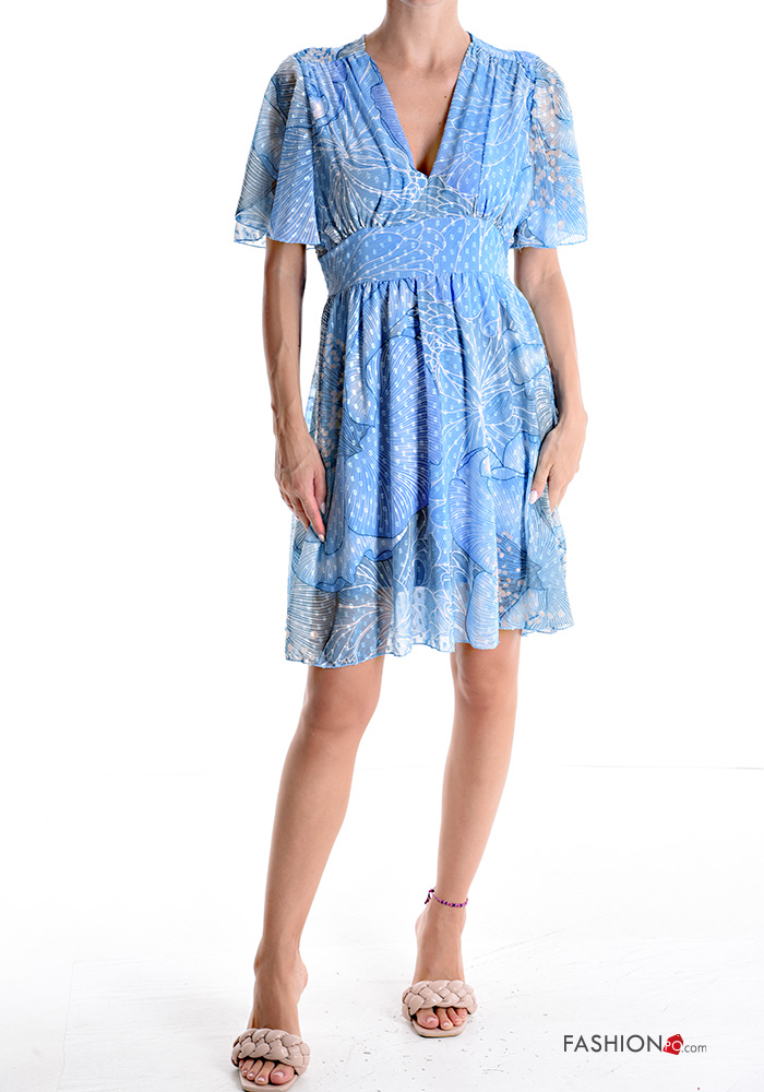 Floral short sleeve knee-length ruffle sleeve Dress with v-neck with lining