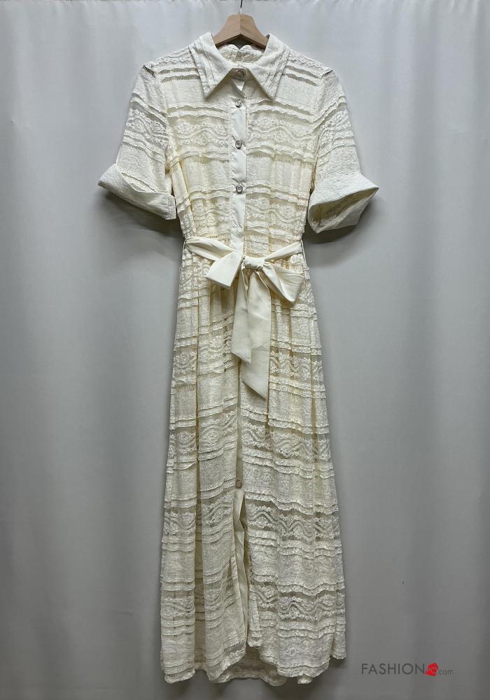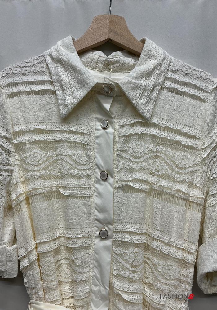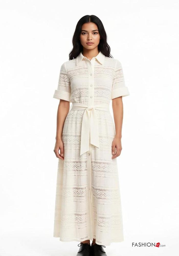 Embroidered lace trim with collar Dress with fabric belt 3/4 sleeve with buttons