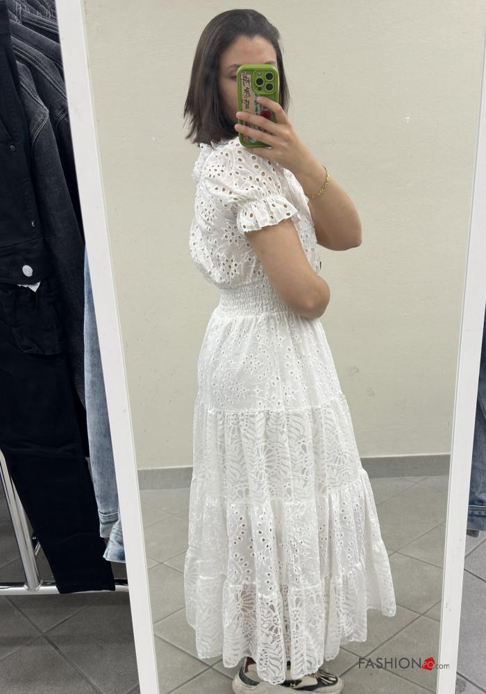 Embroidered puff sleeve short sleeve Cotton Dress with buttons broderie anglaise with elastic with flounces