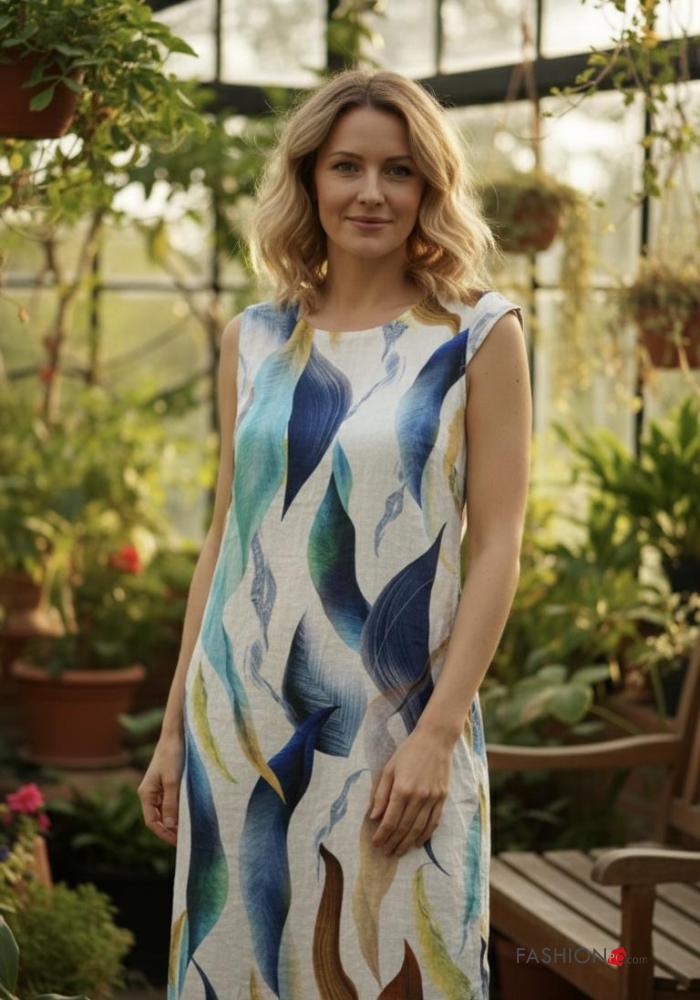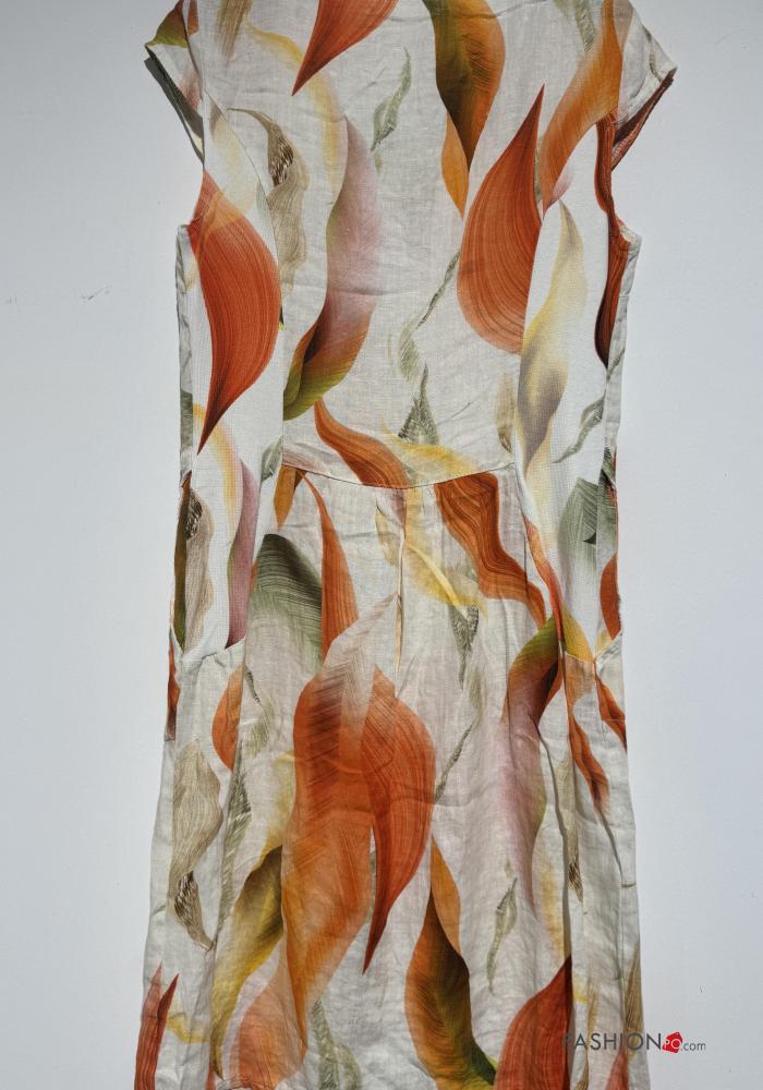 Abstract print short sleeve crew neck Linen Dress