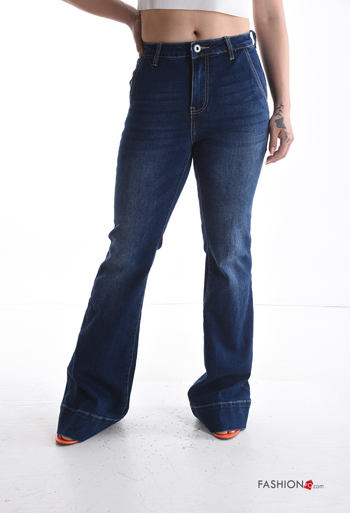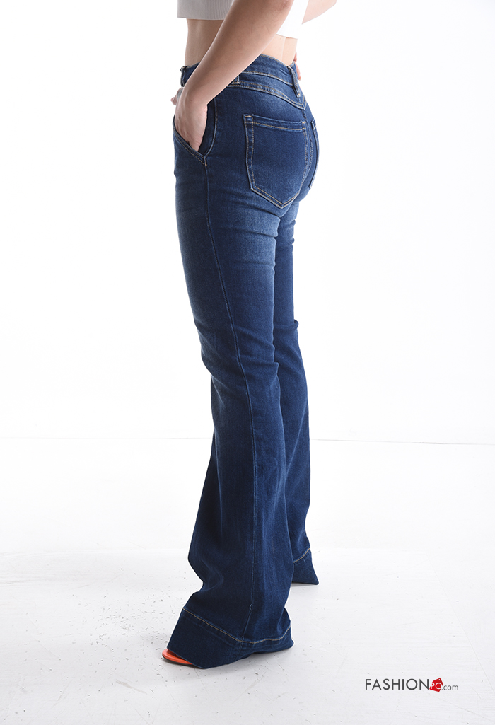 denim long flared Cotton Jeans with buttons with zip with pockets