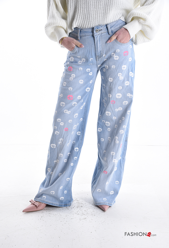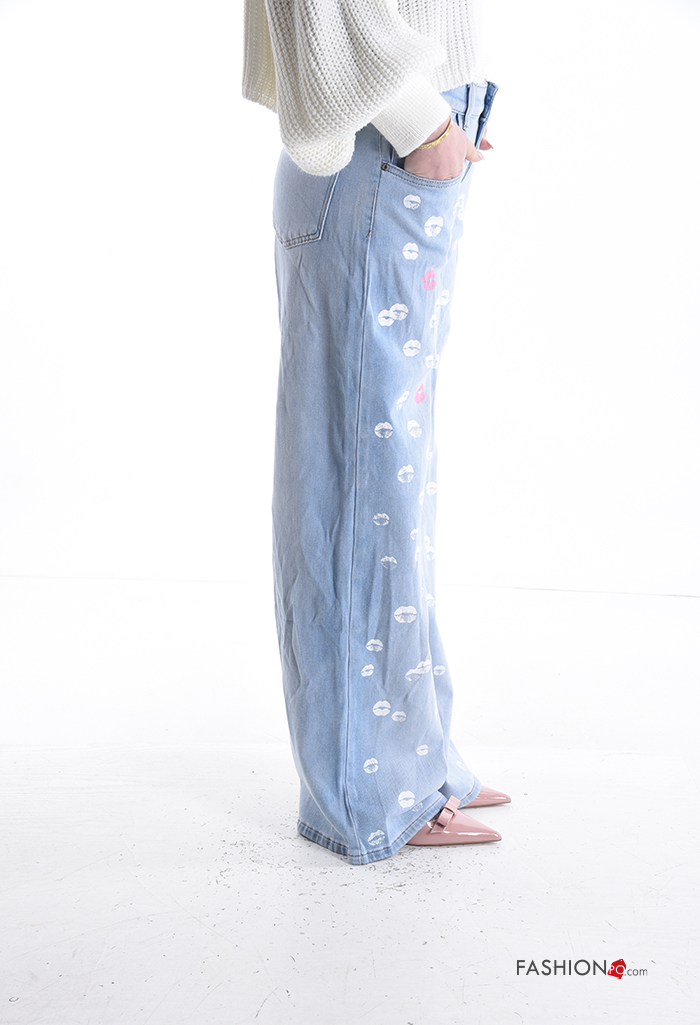Patterned wide leg Cotton Jeans with buttons with zip with pockets