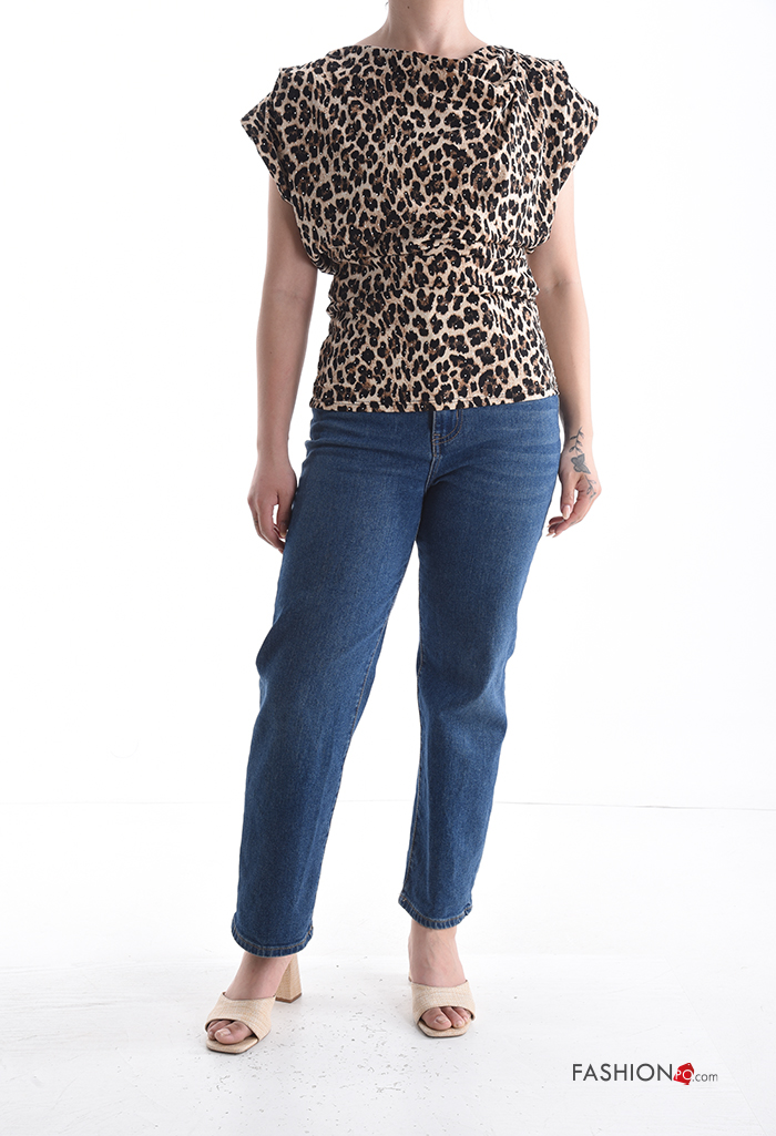 Home > Clothing > Shirts & Blouses > Animal print short sleeve Blouse with rhinestones