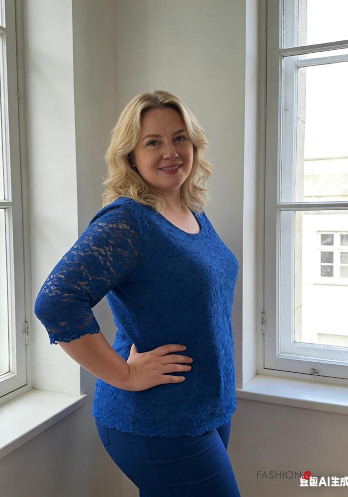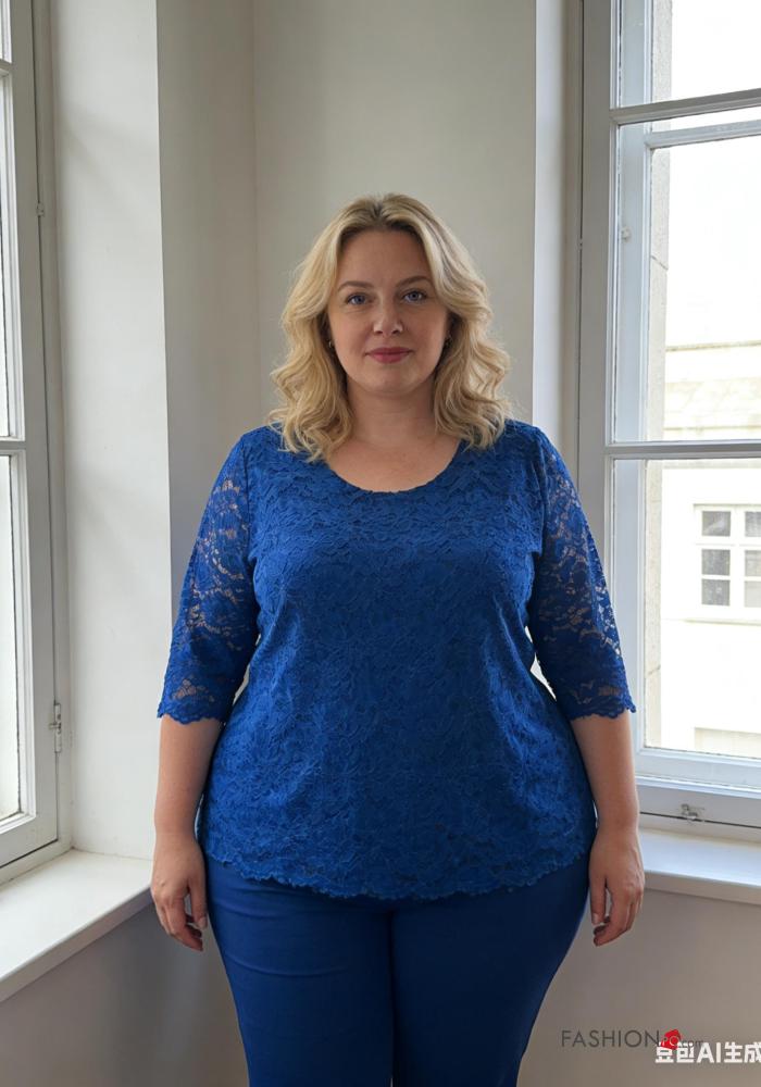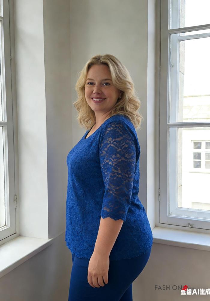 lace trim crew neck oversized Blouse with lining 3/4 sleeve