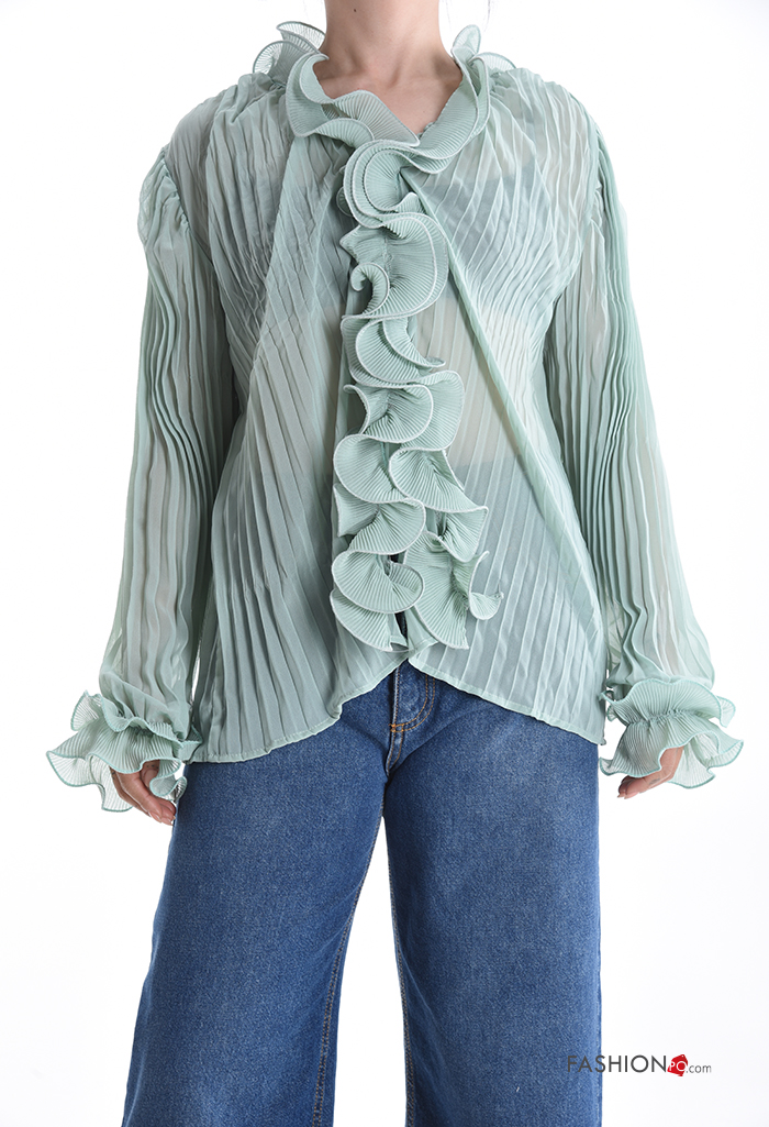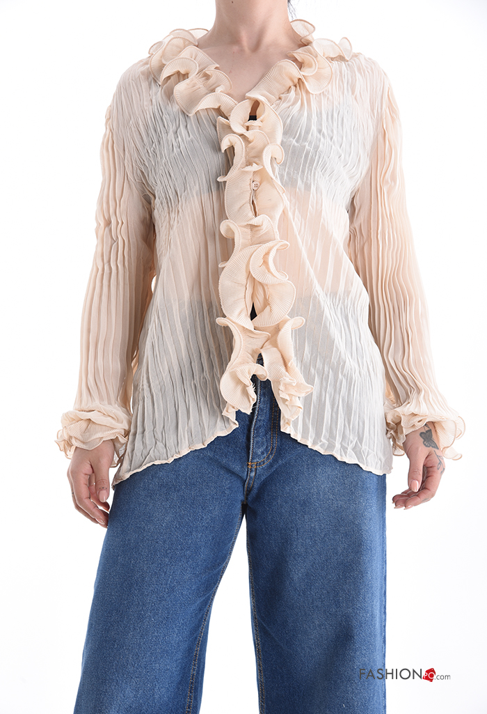 pleated long sleeve Shirt with flounces with v-neck with buttons