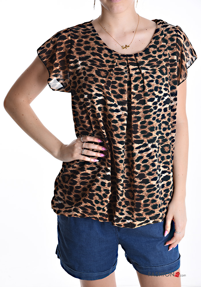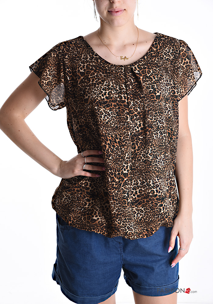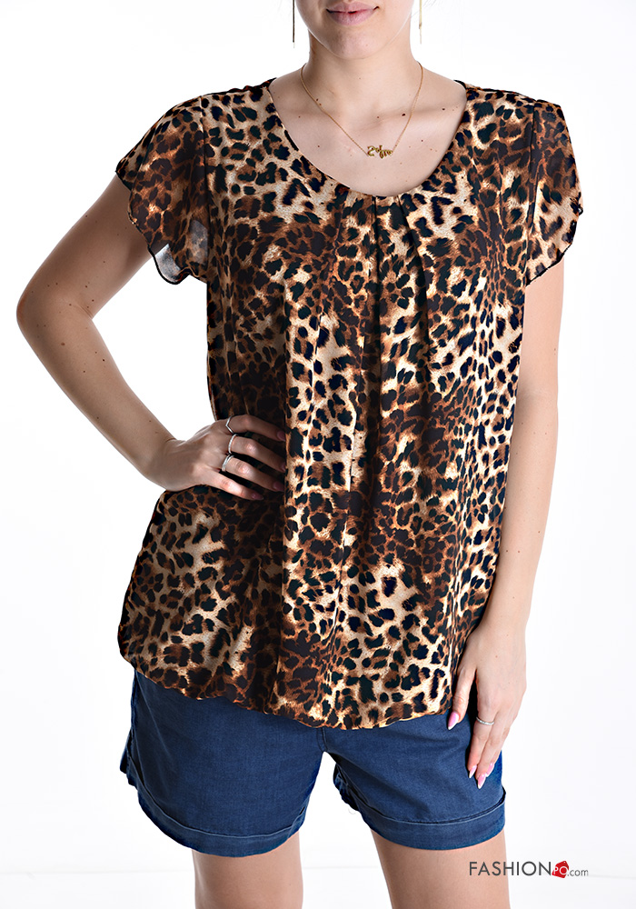 Animal print short sleeve crew neck ruffle sleeve Blouse