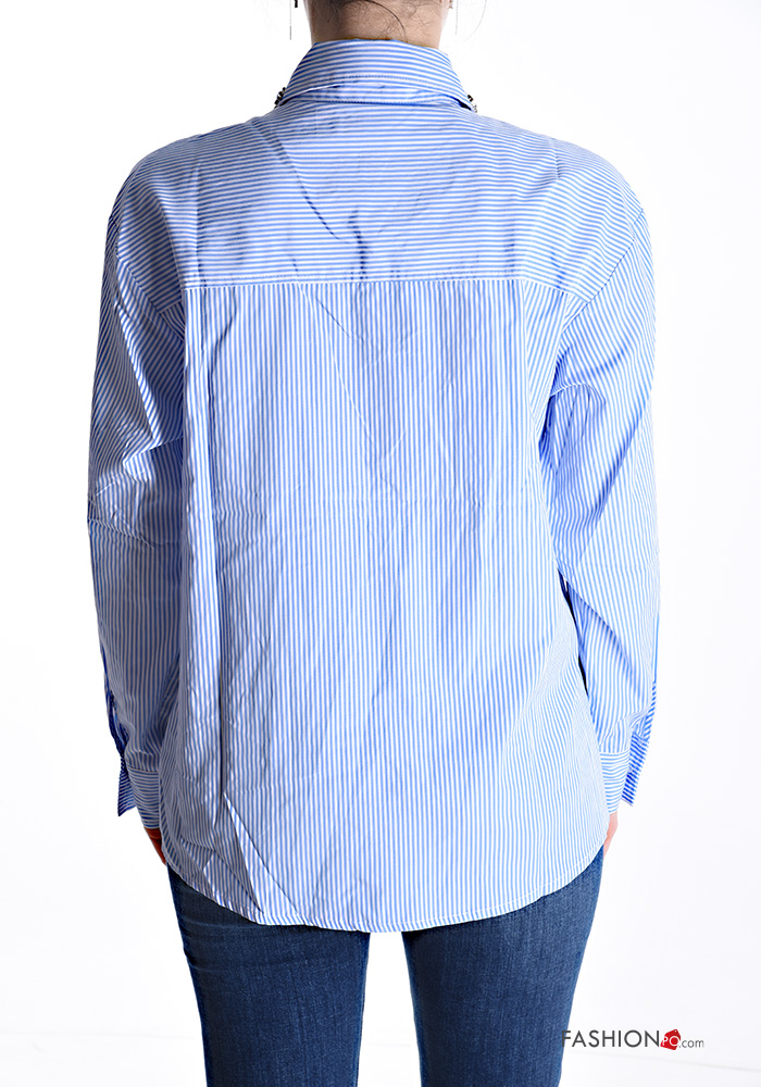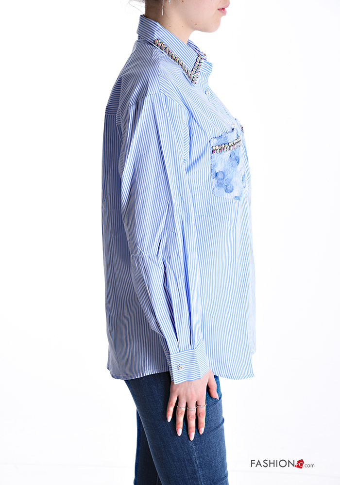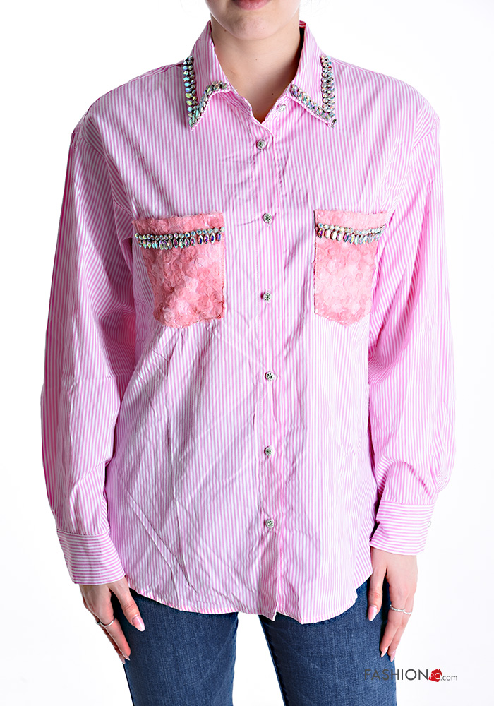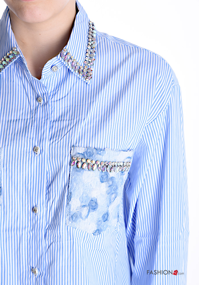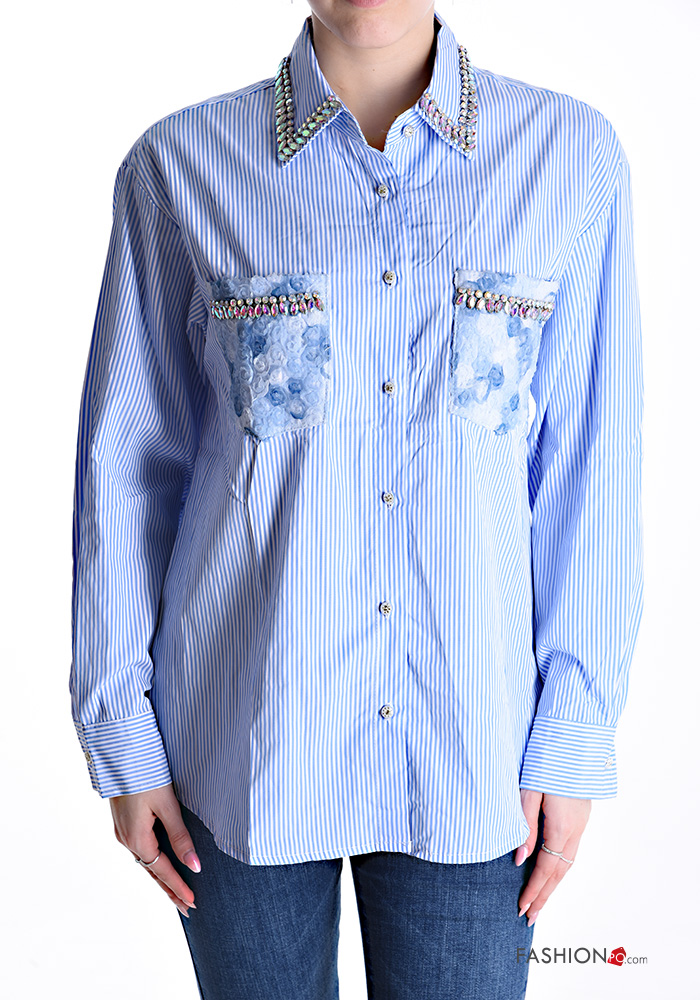 Striped long sleeve with collar Cotton Shirt with buttons with rhinestones with pockets