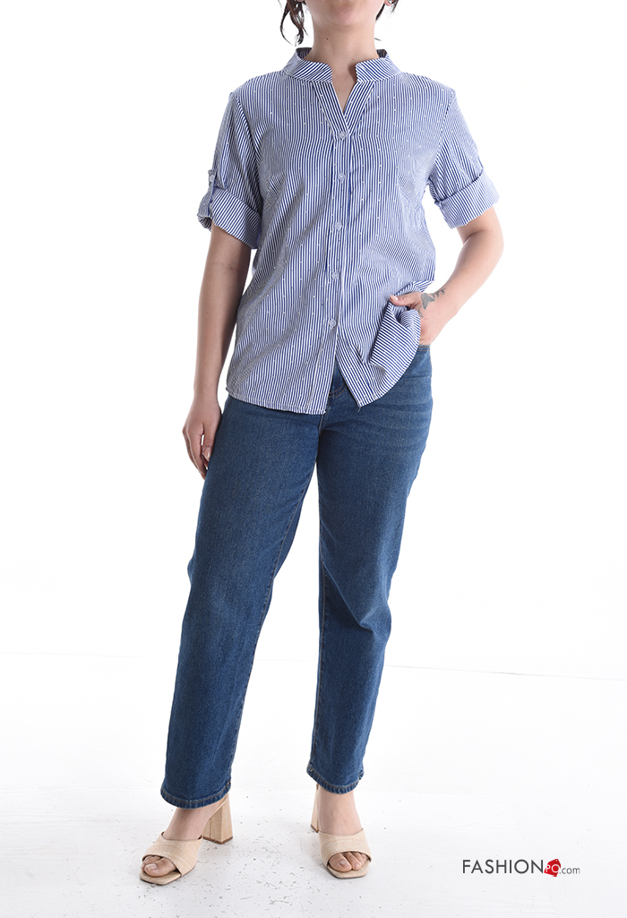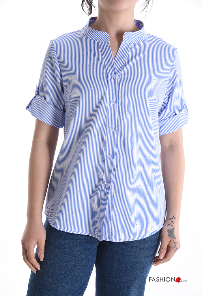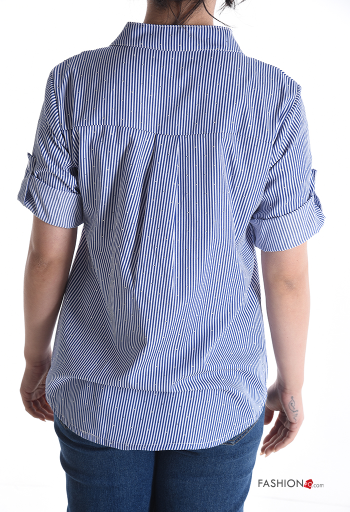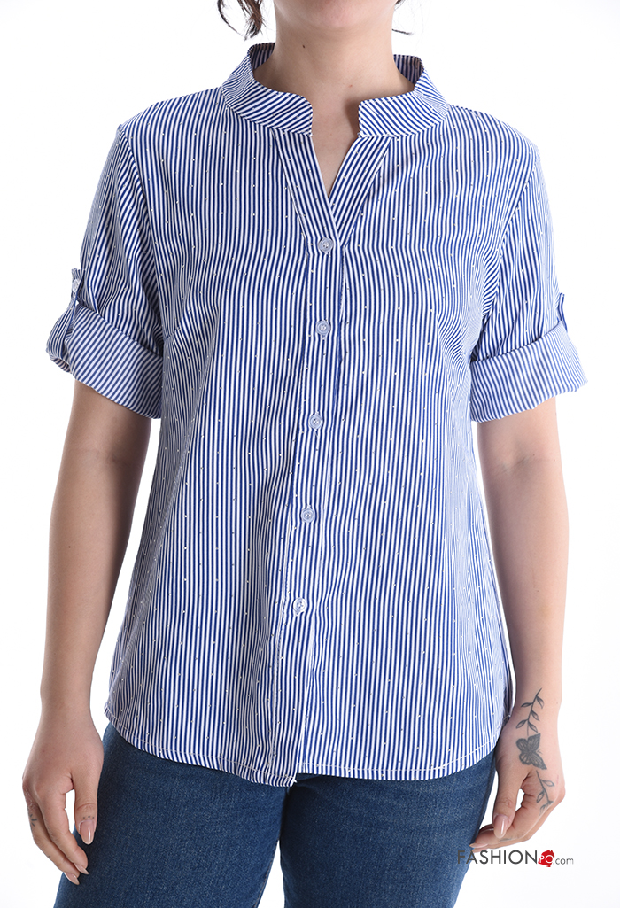 Home > Clothing > Shirts & Blouses > Striped short sleeve crew neck Cotton Shirt with buttons with rhinestones