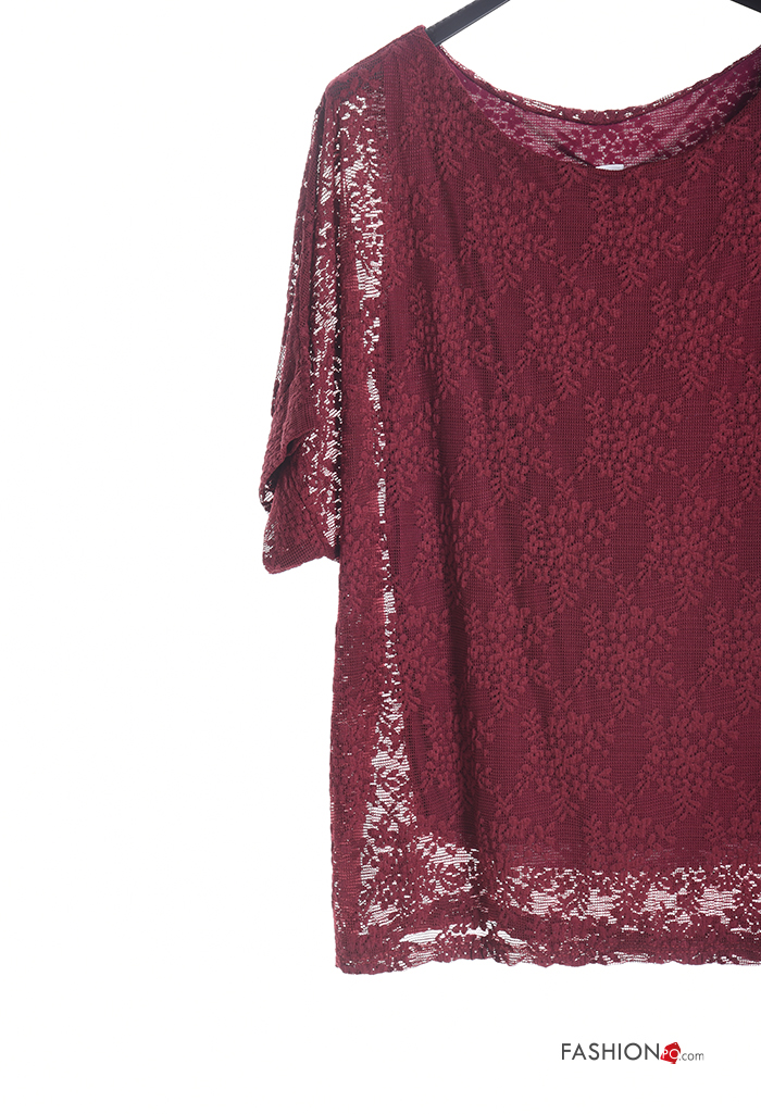 Embroidered short sleeve crew neck lace trim Blouse with lining