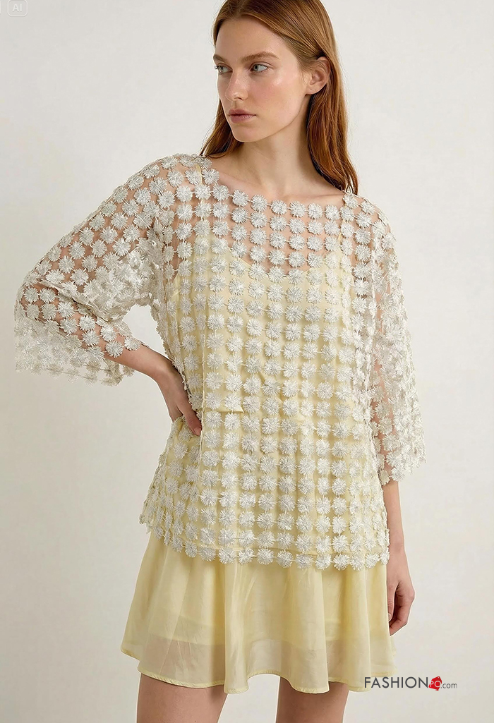 Embroidered fishnet crew neck Long sleeved top