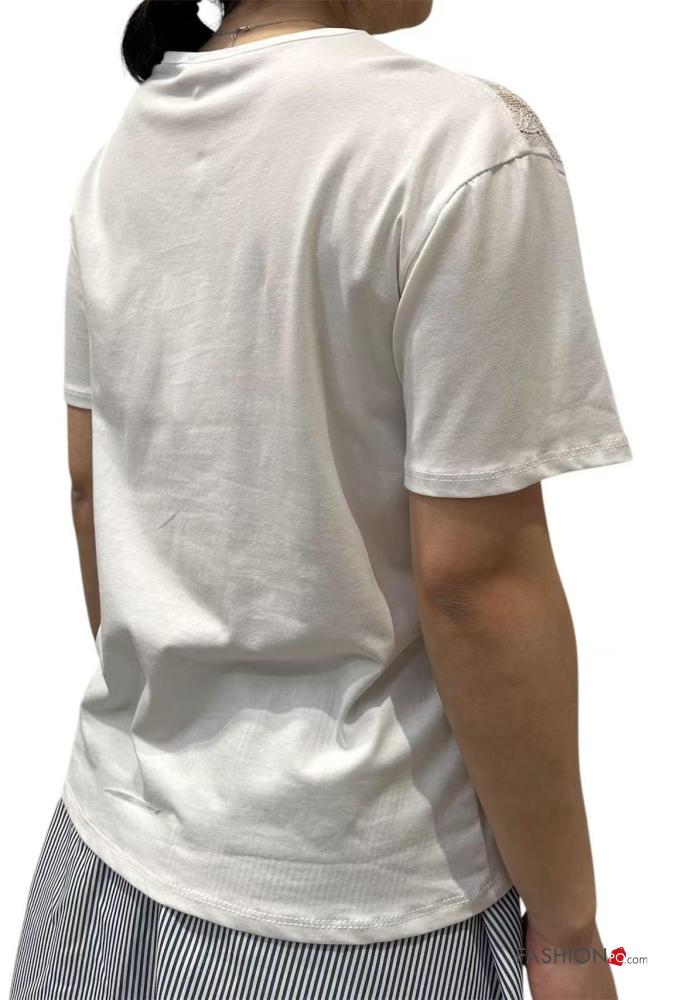 short sleeve crew neck lace trim Cotton T-shirt
