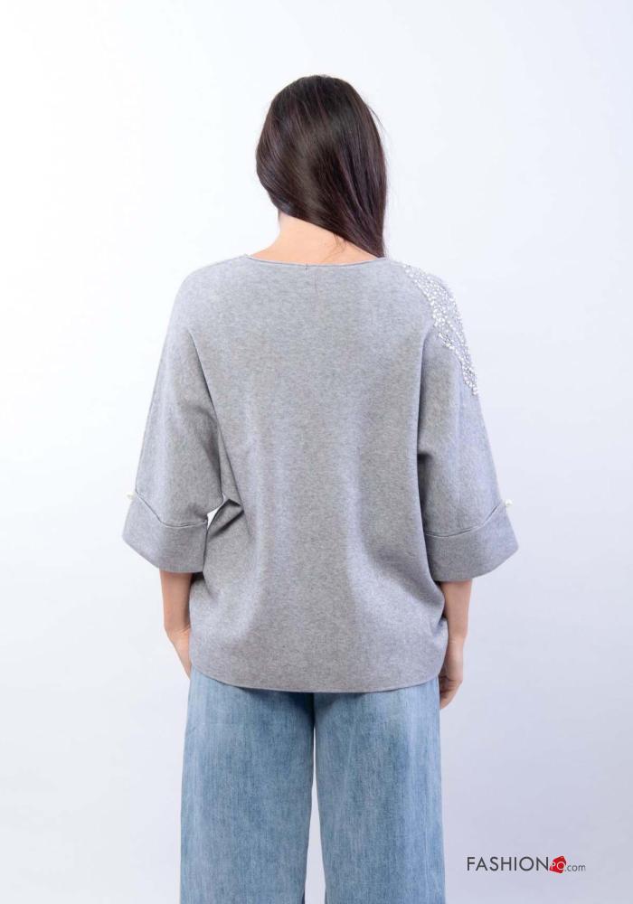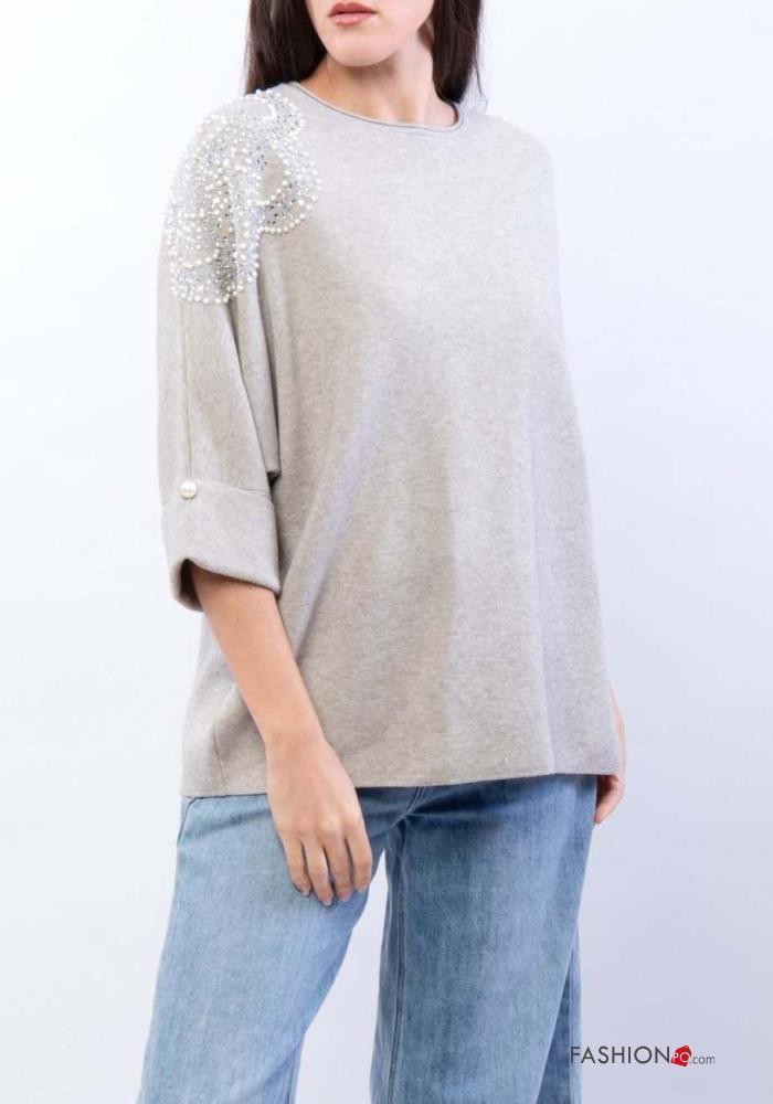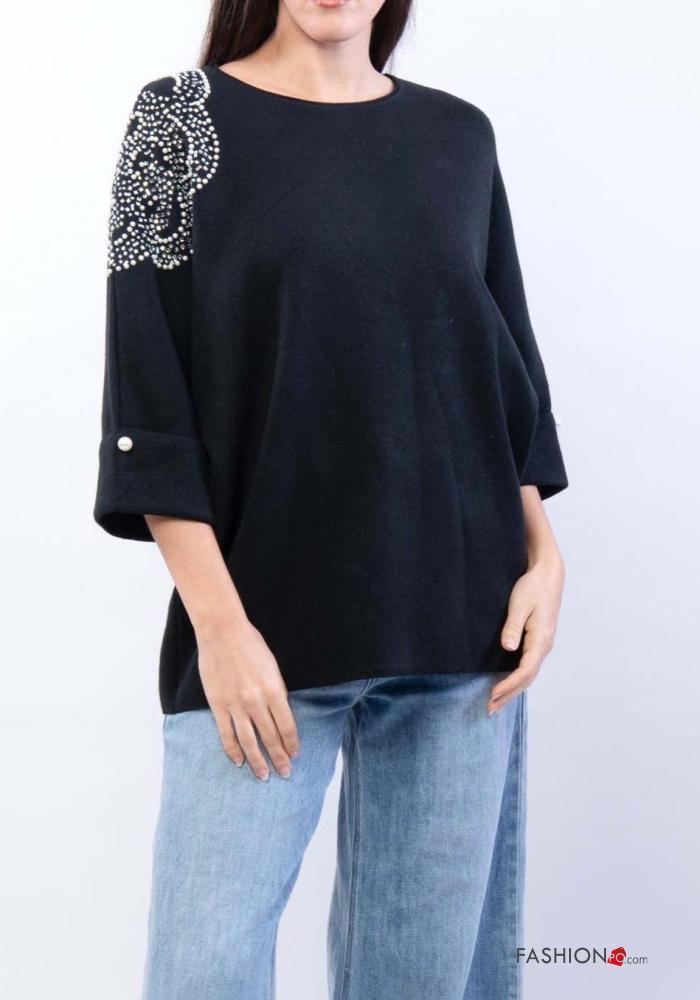 crew neck Sweater with pearls 3/4 sleeve with rhinestones