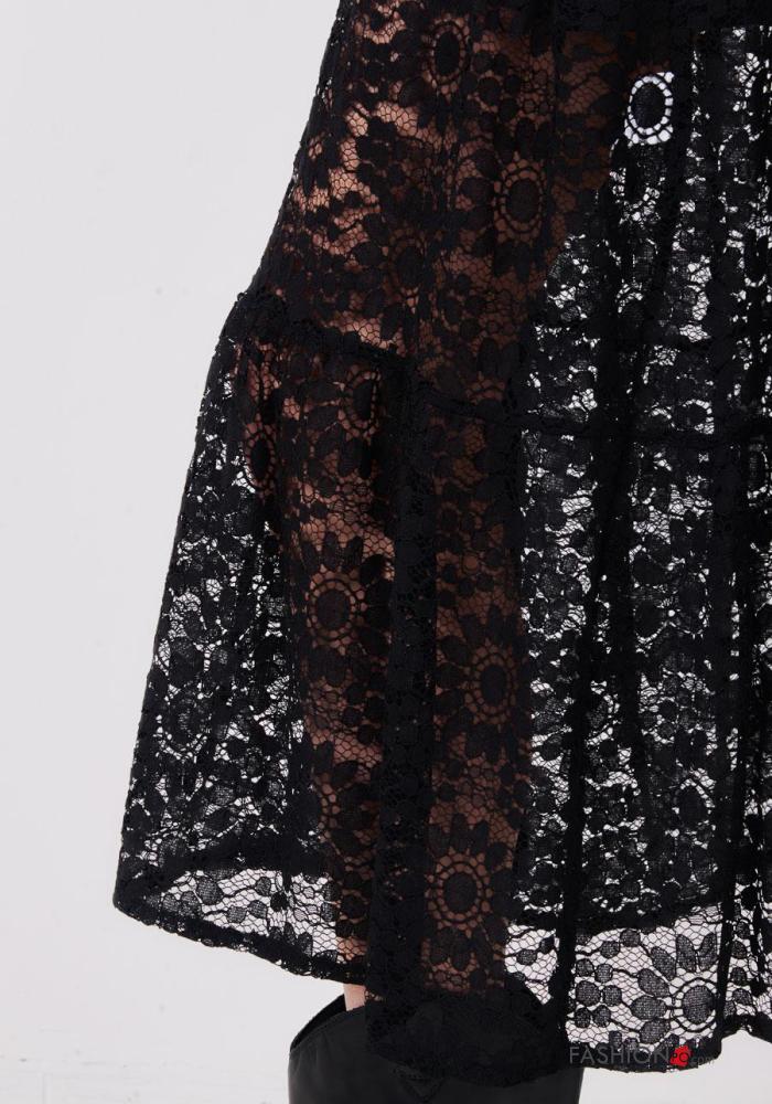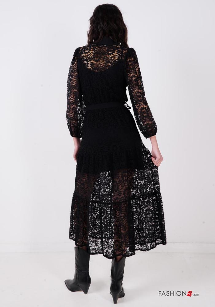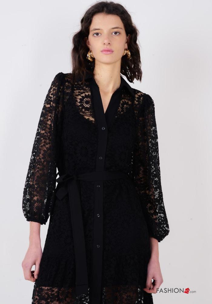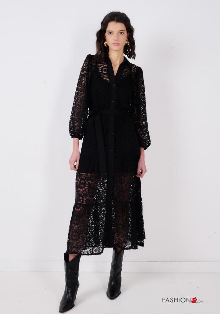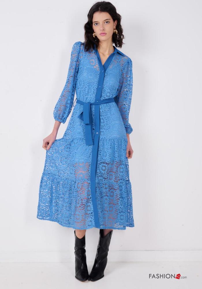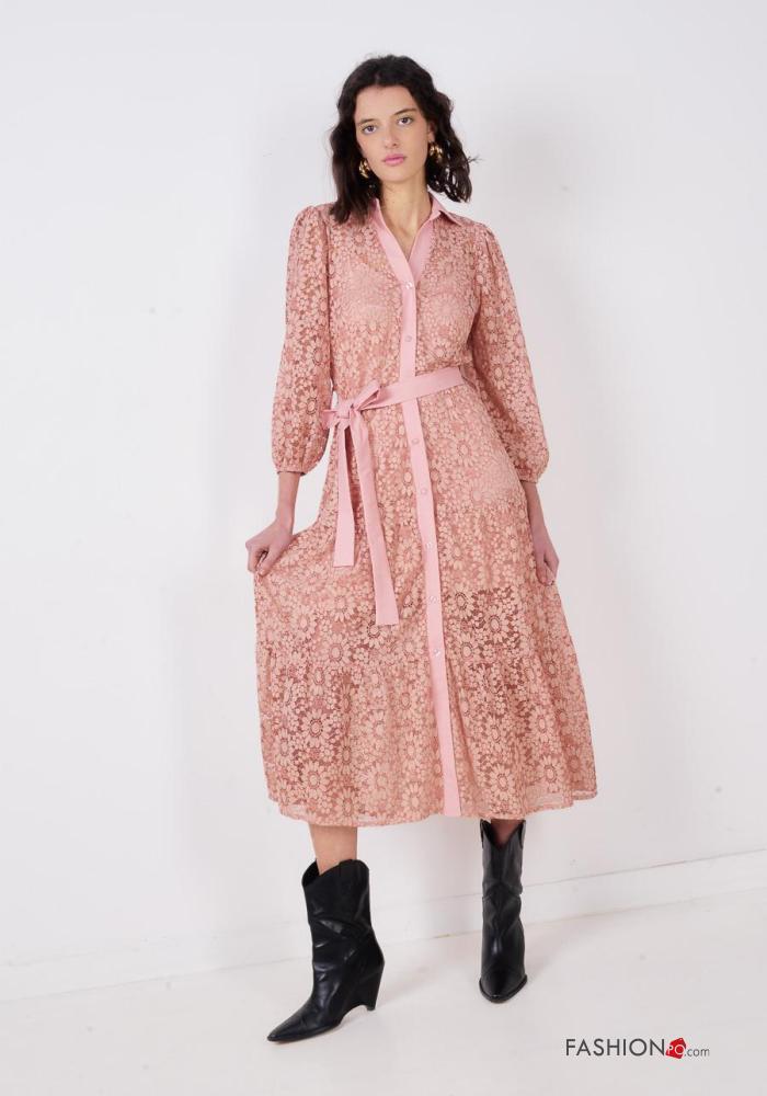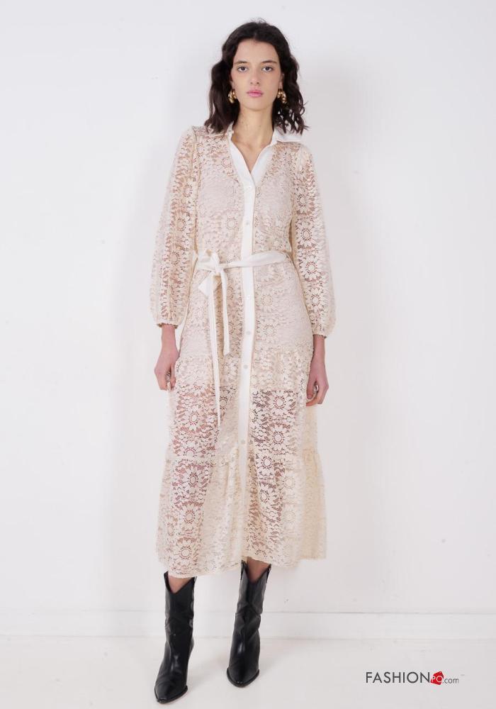 Vestido de Algodón manga larga encaje con cuello Patrón bordado con botones con cinturón de tela