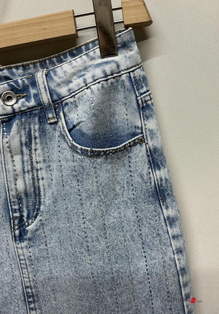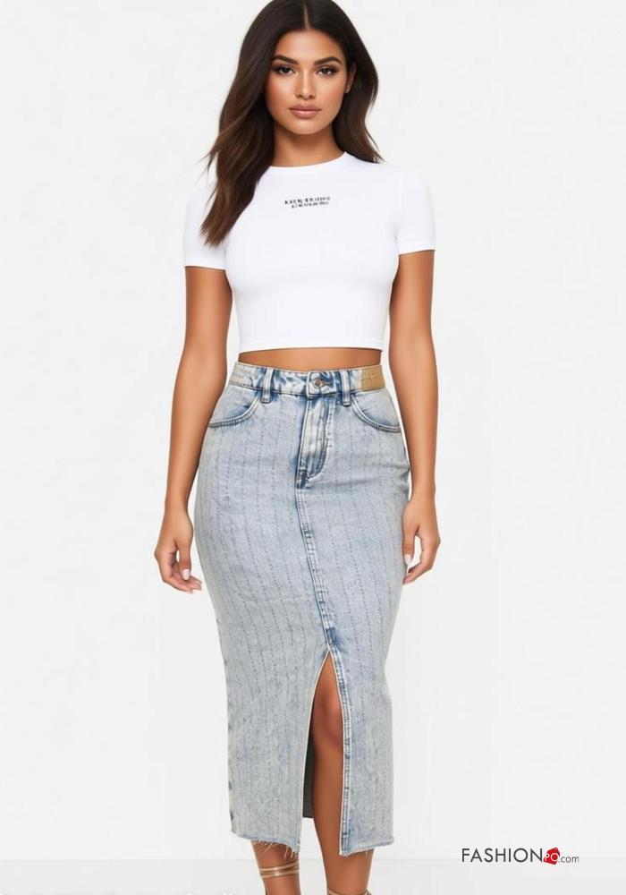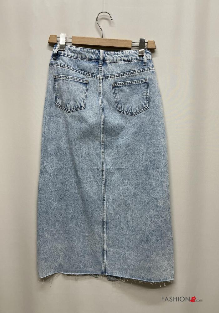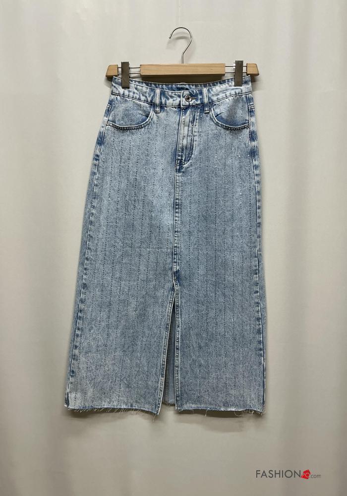 Falda de Algodón tela vaquera Longuette con abertura con cremallera con botones con bolsillos con brillantes