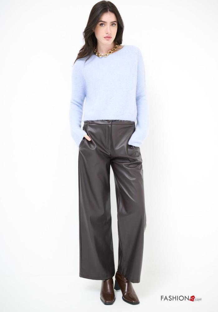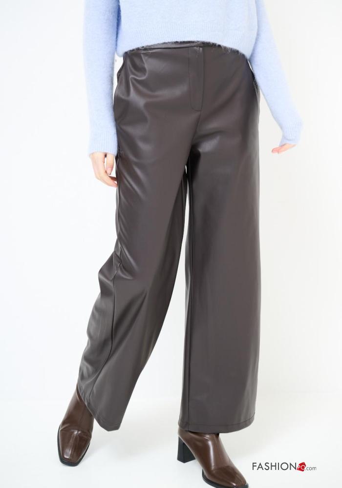 Pantalones imitación de cuero wide leg con bolsillos con cremallera con botones