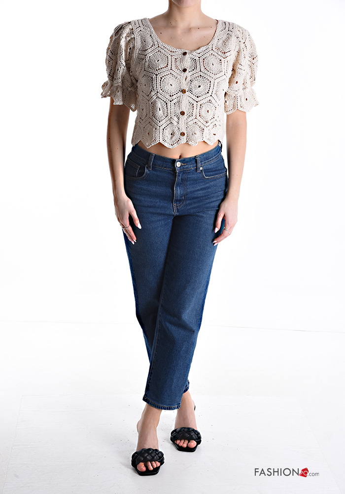Top de Algodón mangas de globo/ abullonada crochet manga corta corto Patrón bordado con botones