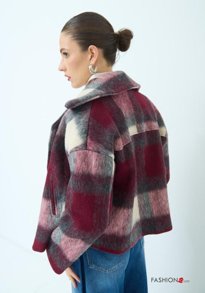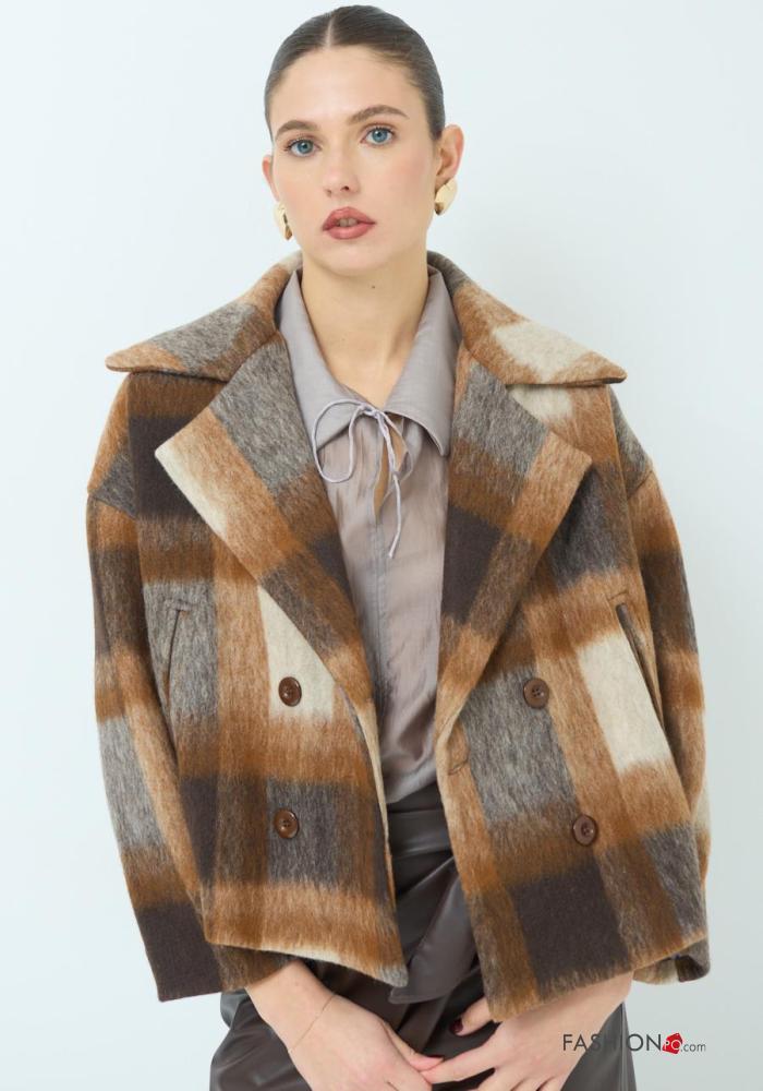 Manteau en Mélange de Laine courte à collet manches longues Imprimé vichy avec poches avec doublure à boutons
