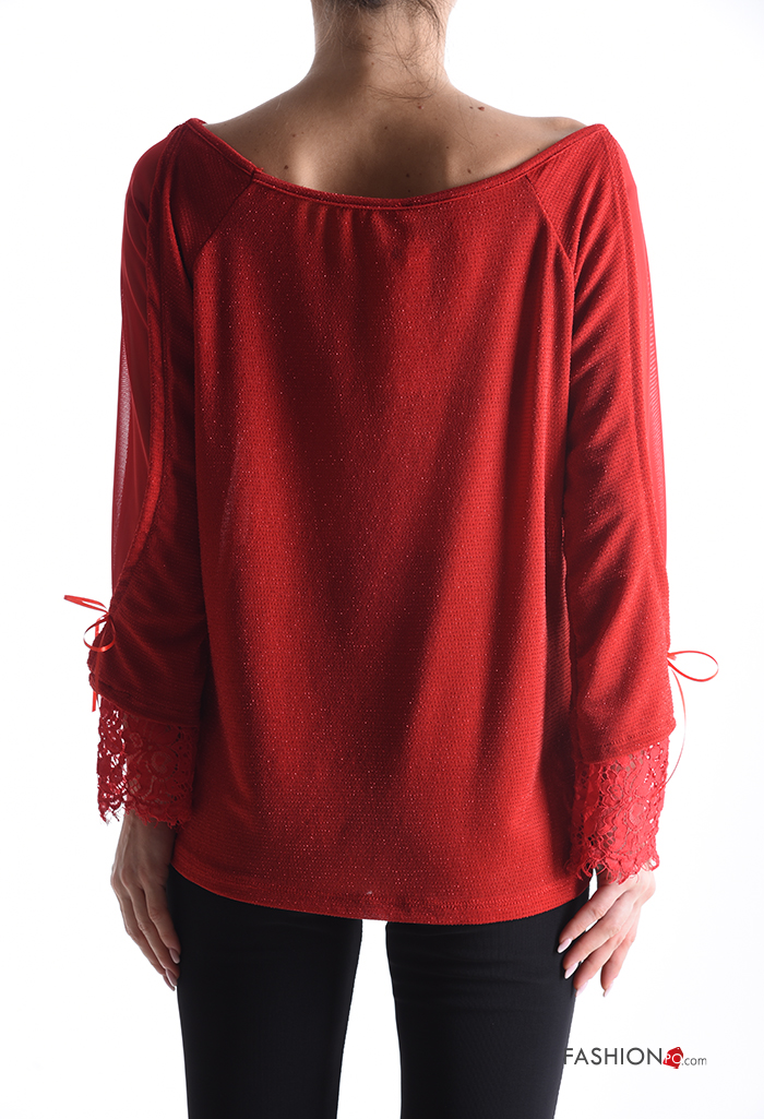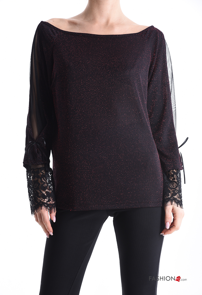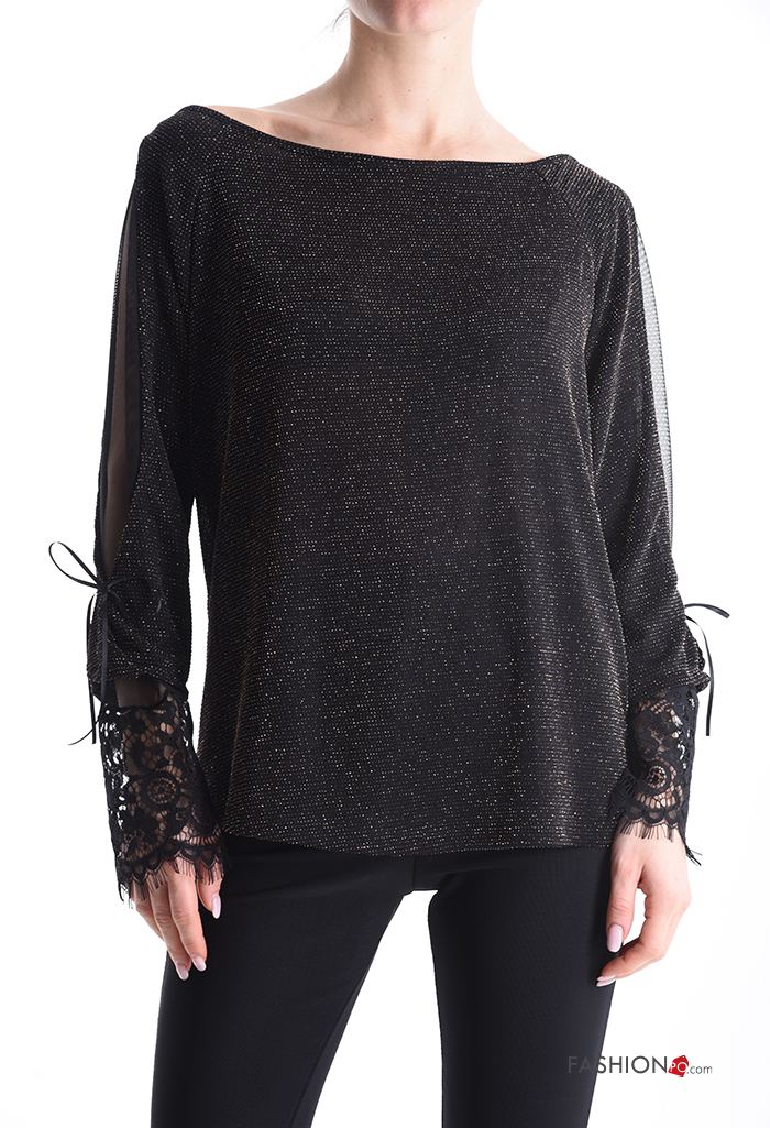 Home > Vêtements > Chemises & Blouses > Blouse détail dentelle lurex avec noeud col bateau