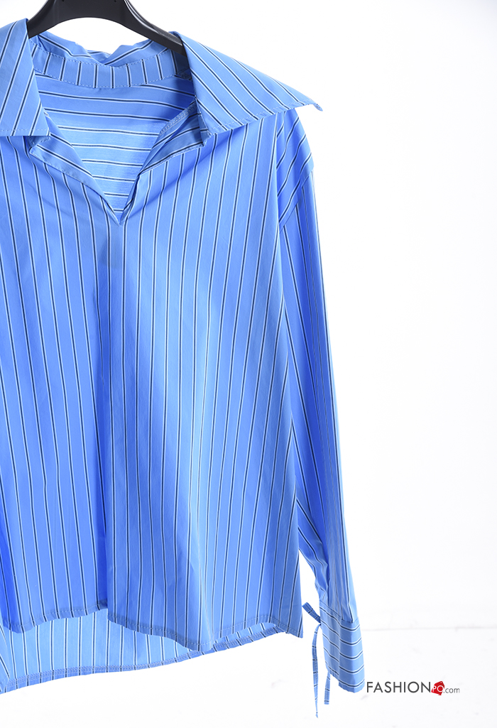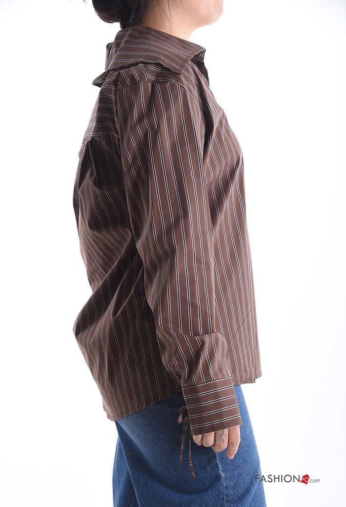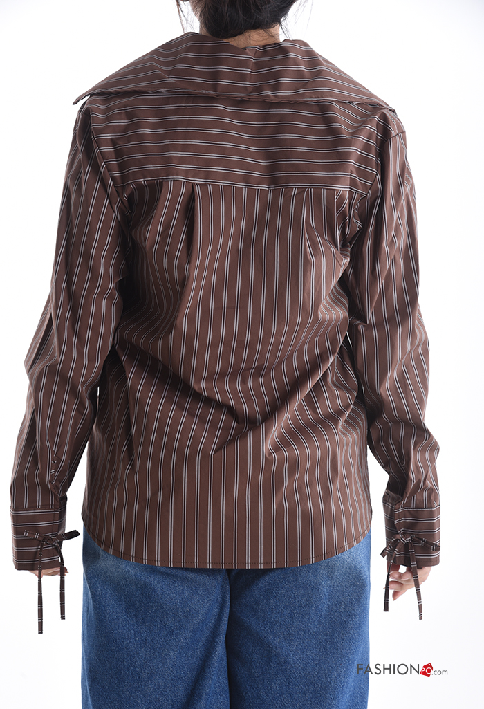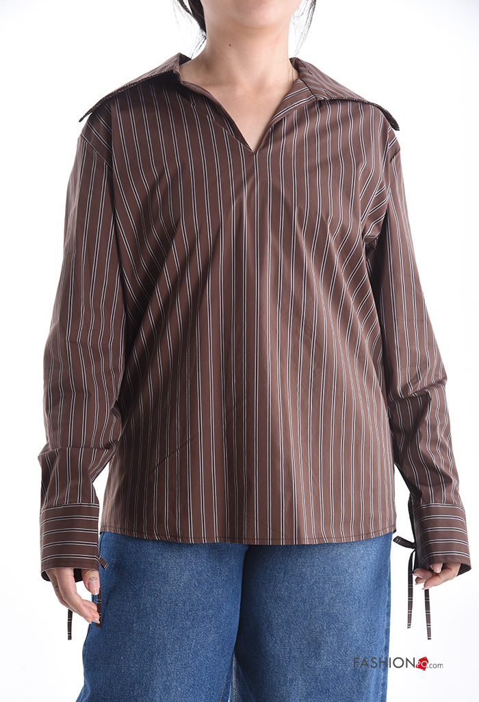Blouse en Coton manches longues à collet Imprimé à rayures avec noeud à col en V