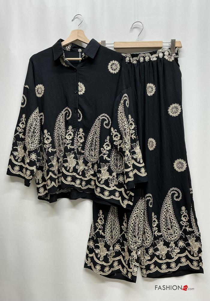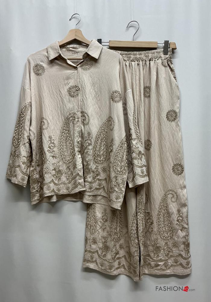 Chemise en Lin wide leg à collet manches longues Imprimé paisley à boutons avec élastique