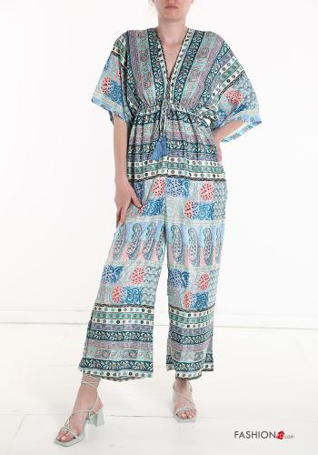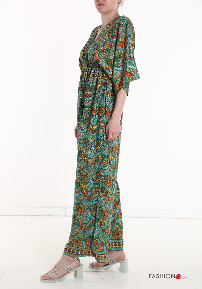 Combinaison en Soie Imprimé jacquard avec élastique à col en V manches à trois-quarts