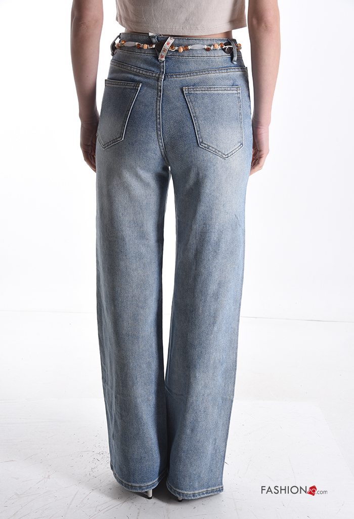 Jeans en Coton en denim avec des perles avec fermeture éclair avec strass avec corde à boutons avec ceinture avec poches